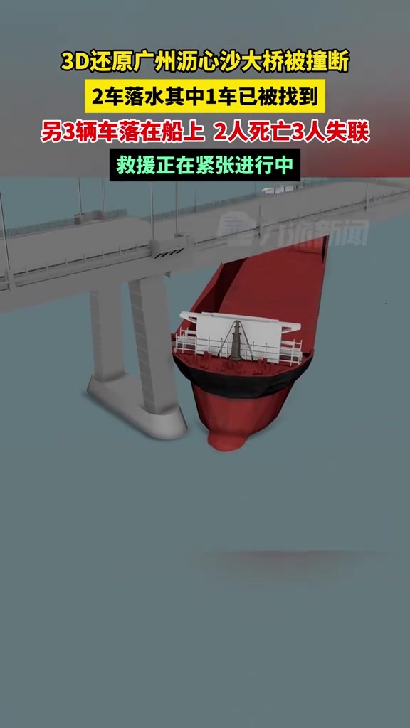 2月22日,航经南沙洪奇沥水道时,因船员操作失当,“良辉688”轮左舷船身触碰沥心沙大桥下行通航孔18#桥墩,随后船头再次触碰下行通航孔19#桥墩,致使该通航孔上的桥面断裂。经核实,共有4辆车和1辆电动摩托车从断裂处坠落,其中1辆空载中巴车、1辆货车和1辆电动摩托车坠落到“良辉688”船舱内,2辆小货车掉落水中。在该事故中,造成5人死亡(空载中巴车驾驶员1人、电动摩托车驾驶员1人、落水小货车3人),2人在医院救治,目前生命体征稳定;肇事船舶一名船员轻微伤。详情>>