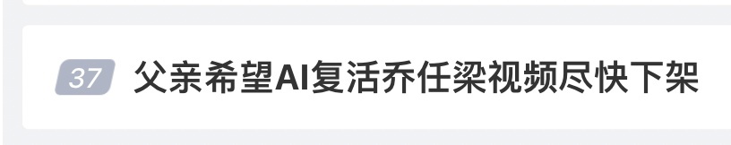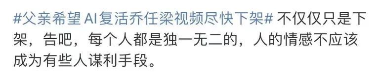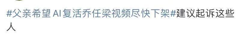 3月16日,针对儿子肖像被侵权使用一事,乔任梁父亲发声,他已经看到网上传播开来的“儿子被复活”影像,不能接受,感到不舒适,希望对方尽快下架,“他们未征求我们同意,是我侄女刷到视频发给我的,这是在揭伤疤。”