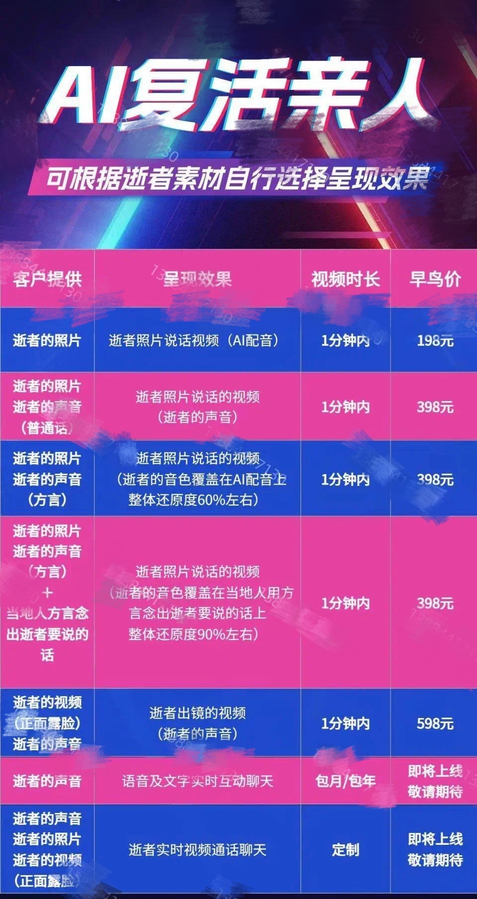 一名为“AI复活亲人”的网友在账号简介处写着:一段视频或者照片,一段音频就能与逝去的亲人再次相见。他在近日发布了一段乔任梁被“复活”的视频,很多粉丝被吸引来后询问如何收费。