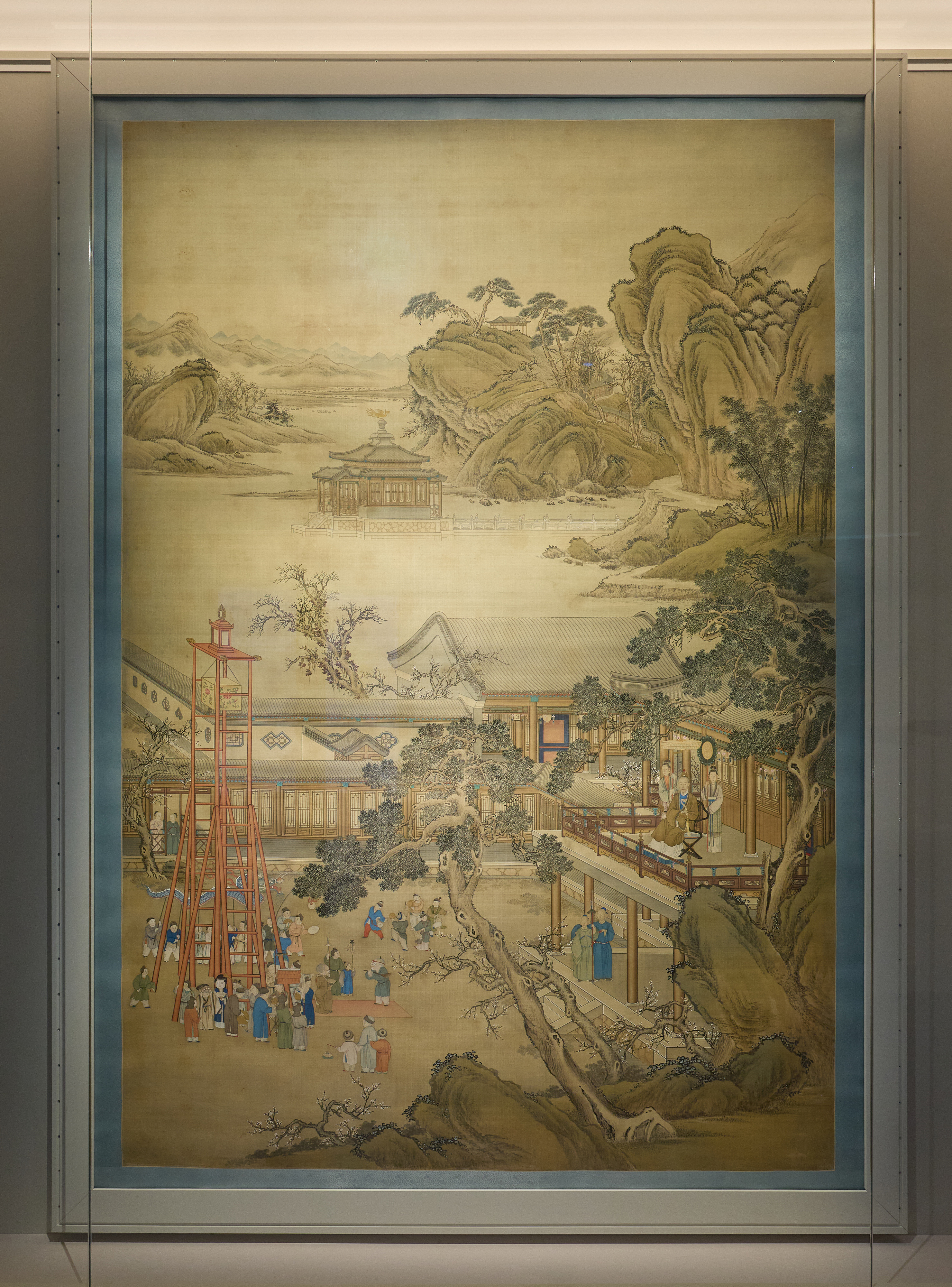 此外,在“时令节庆”单元展出的巨型贴落《乾隆帝元宵行乐图》也备受关注,展现了宫廷在元宵前后放烟火及赏灯等场景。香港故宫文化博物馆助理研究员梁慧淇表示,贴落类似现代的墙纸,以往博物馆多数展出的是带有卷轴的书画,而贴落面积较大且无法悬挂,在运输和展览时颇具挑战,需要用特制的大型框架固定。