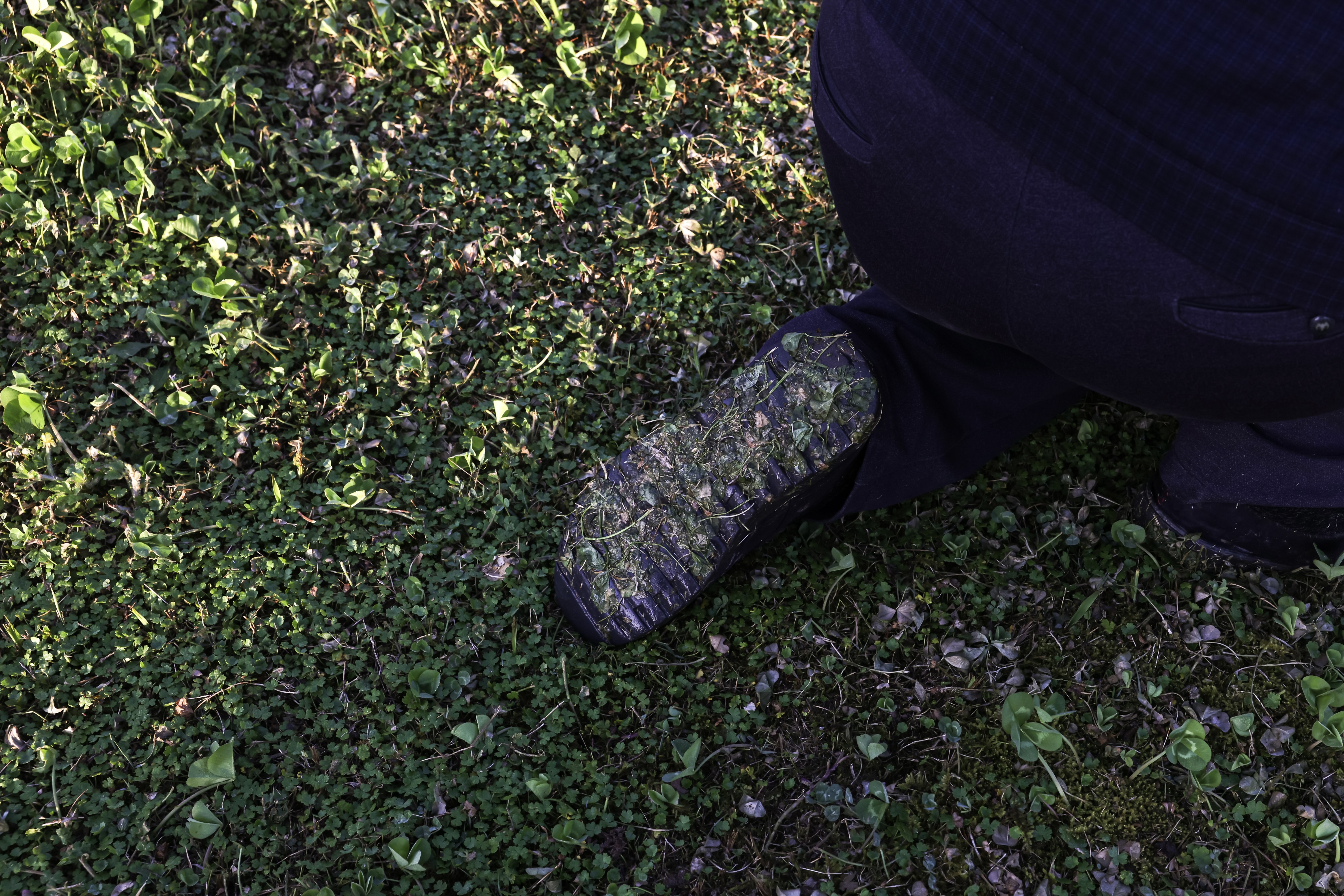 王建刚跪着擦拭无名烈士墓碑,他的鞋底沾满青草。