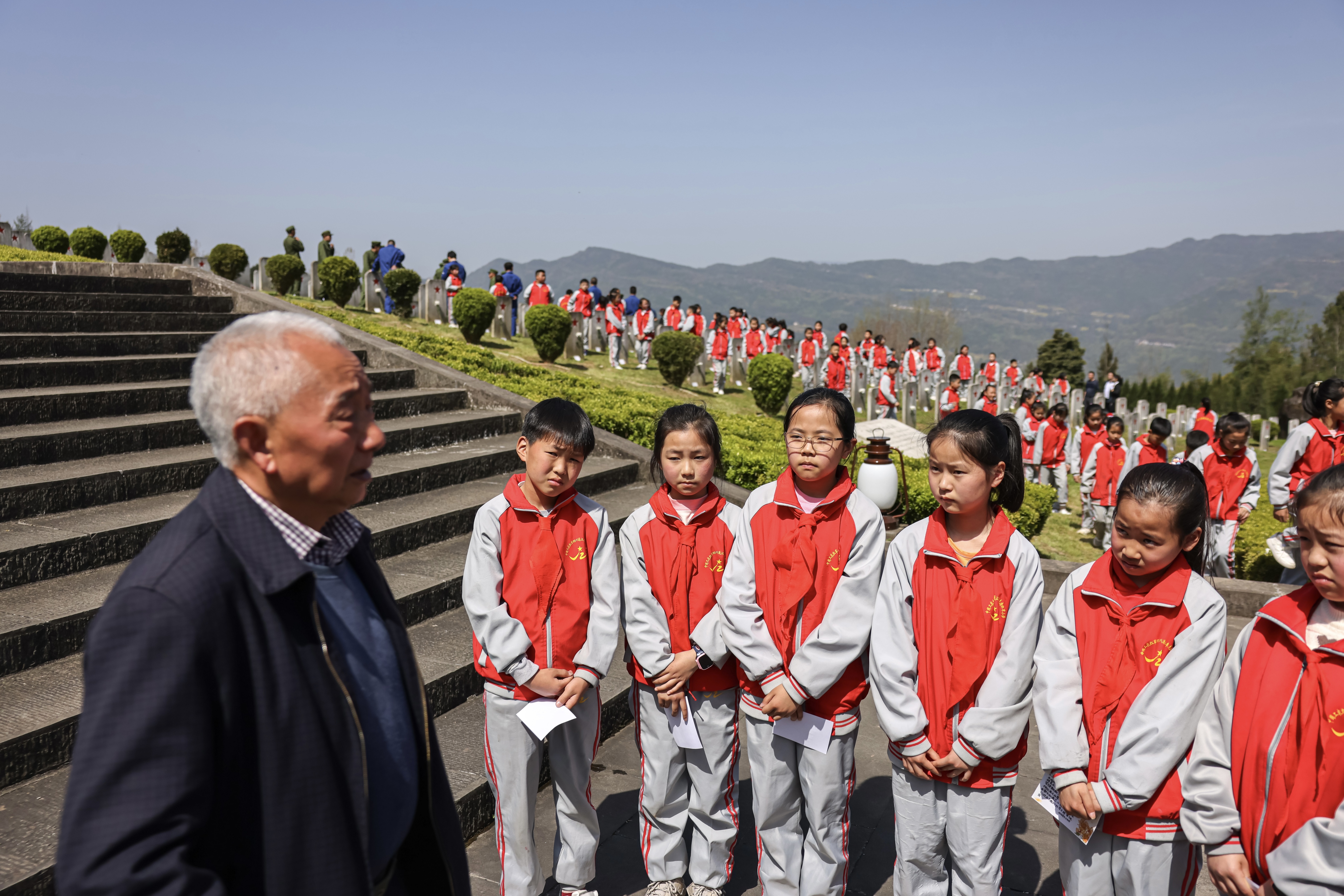王建刚为前来祭扫烈士的学生们讲红军的故事。
