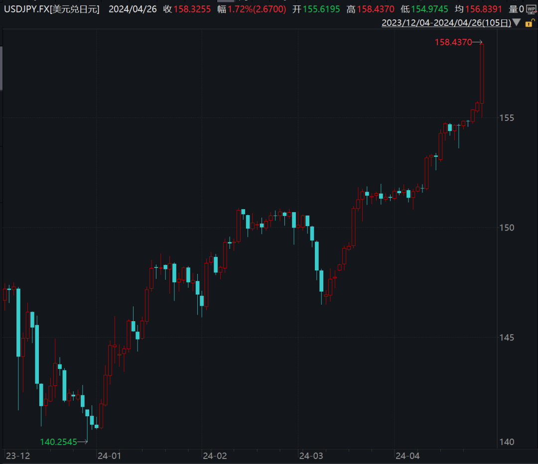 过去24小时,美元兑日元连续跌破156、157和158的整数关口。国际投资者正大举押注日元贬值,而日本政府何时出手干预汇率值得关注。