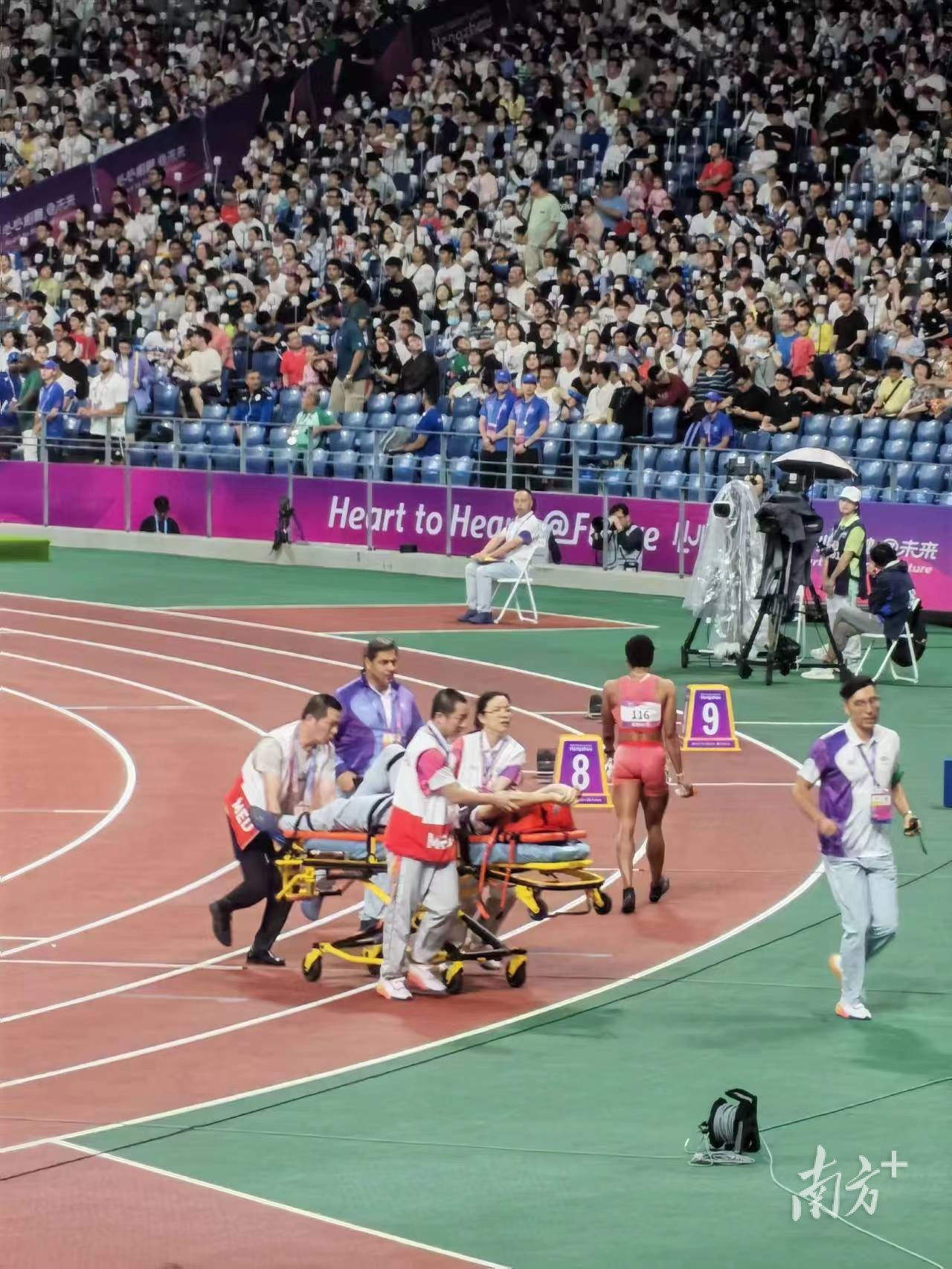 在这位技术官员受伤后,现场立即进行了紧急处理,担架进场,由医务人员运送出场外。