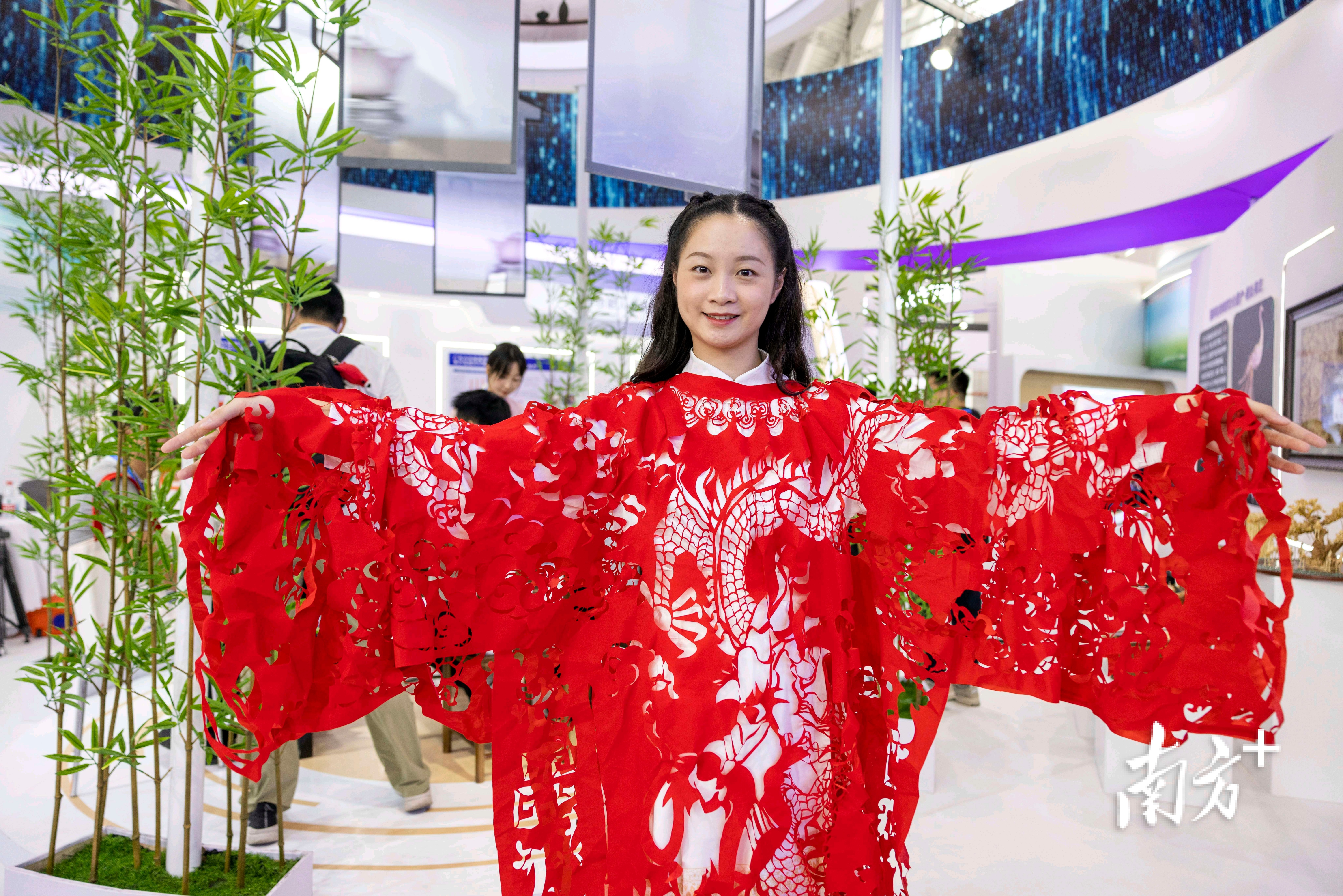 一身红色长袍,盘着九条蟠龙,走近一看竟是剪纸作品!国家级非物质文化遗产项目(潮阳剪纸)市级传承人陈小燕现场展示了南派剪纸的精湛技艺。