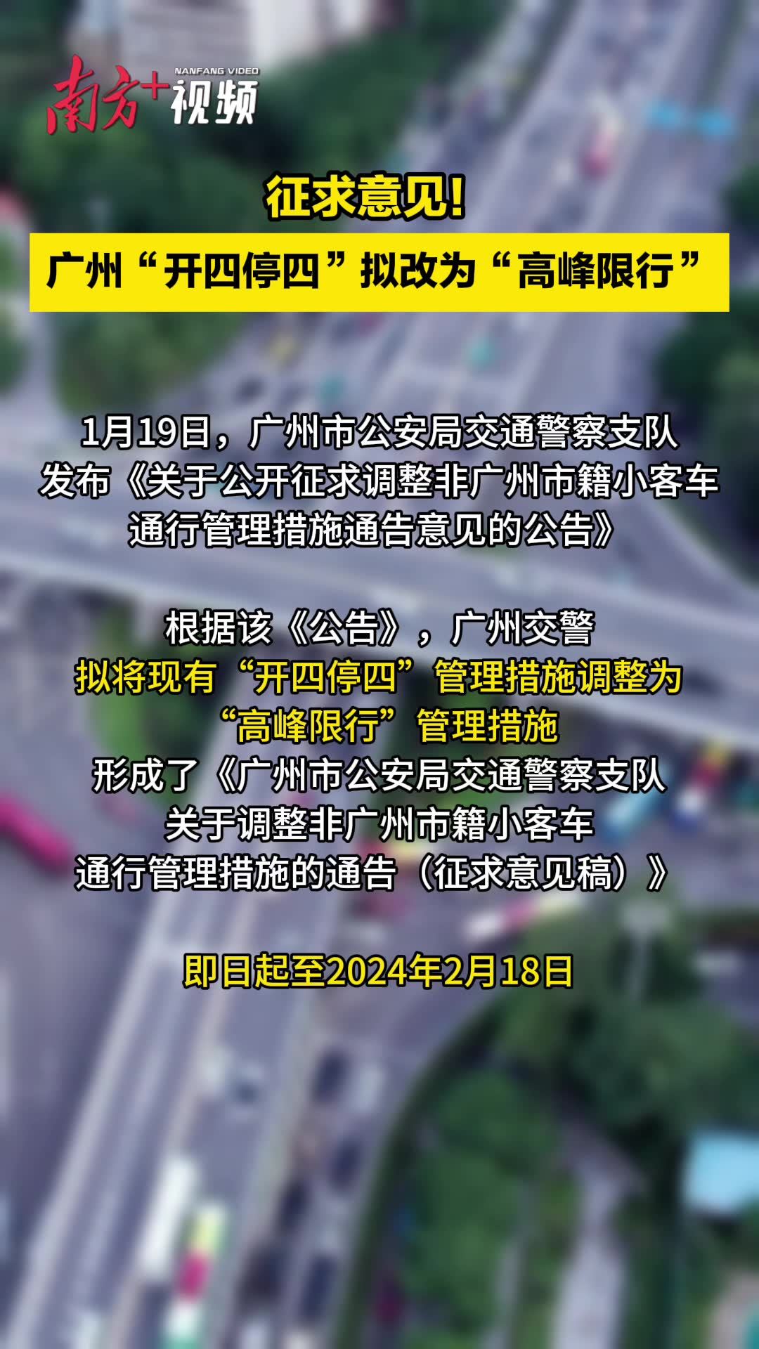1月19日,广州市公安局发布《广州市公安局交通警察支队关于公开征求调整非广州市籍小客车通行管理措施通告意见的公告》。其中提到,拟对现有“开四停四”管理措施调整为“高峰限行”管理措施。从即日起至2024年2月18日,公开征求社会公众的意见。