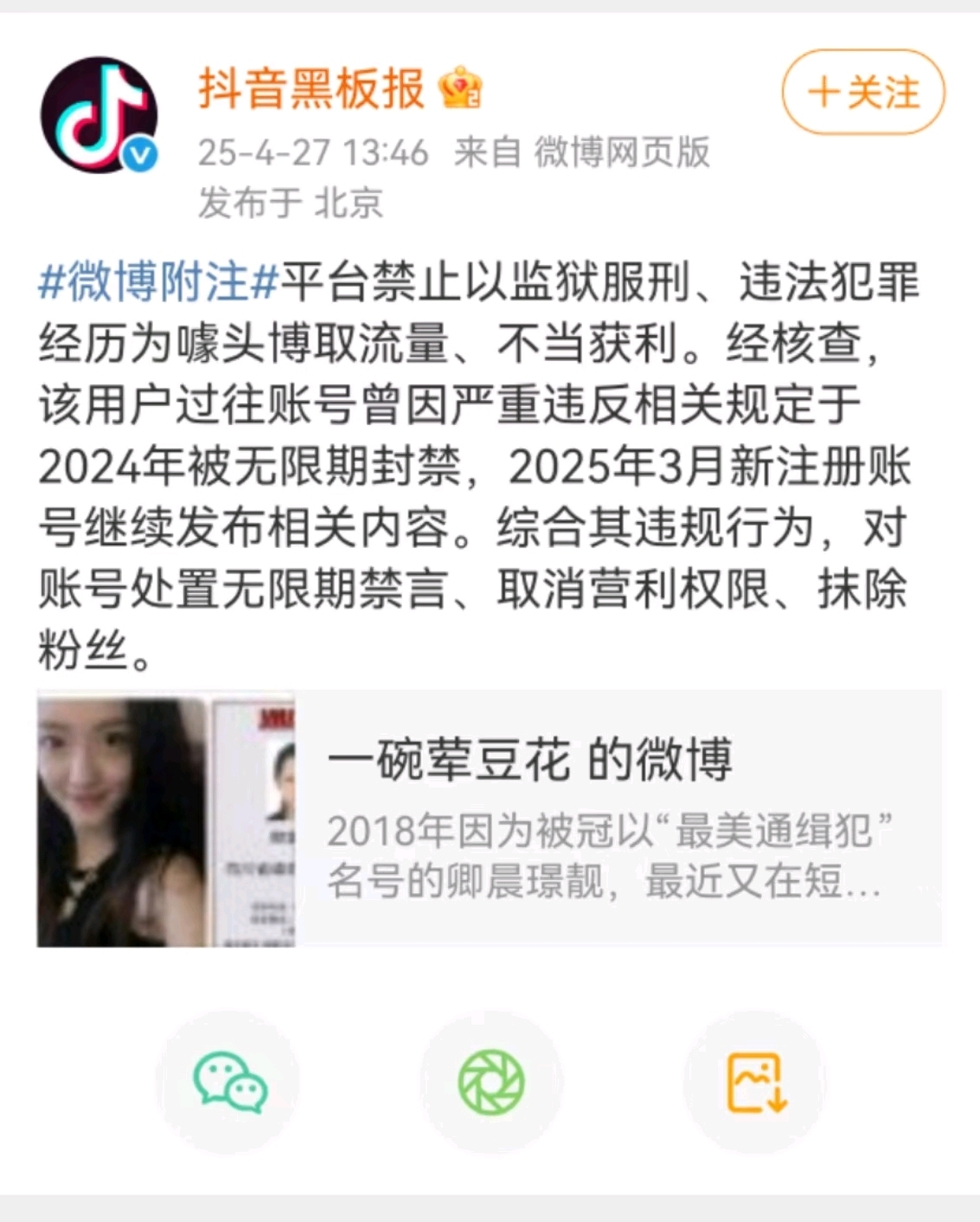 4月27日,@ 抖音黑板报 发文称,平台禁止以监狱服刑、违法犯罪经历为噱头博取流量、不当获利。经核查,该用户过往账号曾因严重违反相关规定于2024年被无限期封禁,2025年3月新注册账号继续发布相关内容。综合其违规行为,对账号处置无限期禁言、取消营利权限、抹除粉丝。