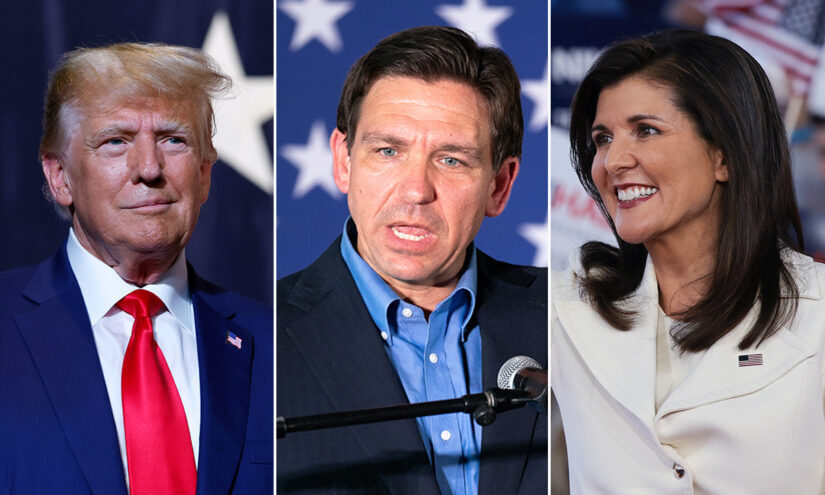 共和党三名总统候选人,从左至右:特朗普、德桑蒂斯、黑利