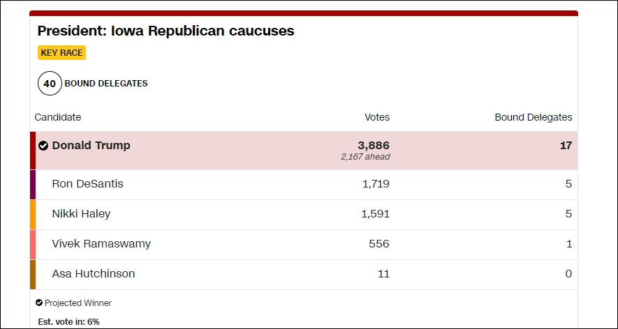 CNN统计的结果显示,截至当地时间9点半,特朗普已赢得约4000张选票,得票率超50%。德桑蒂斯和黑利差距不大,正在对第二名展开激烈角逐。当前,德桑蒂斯获得超1700名选民支持,略高于黑利约100票。