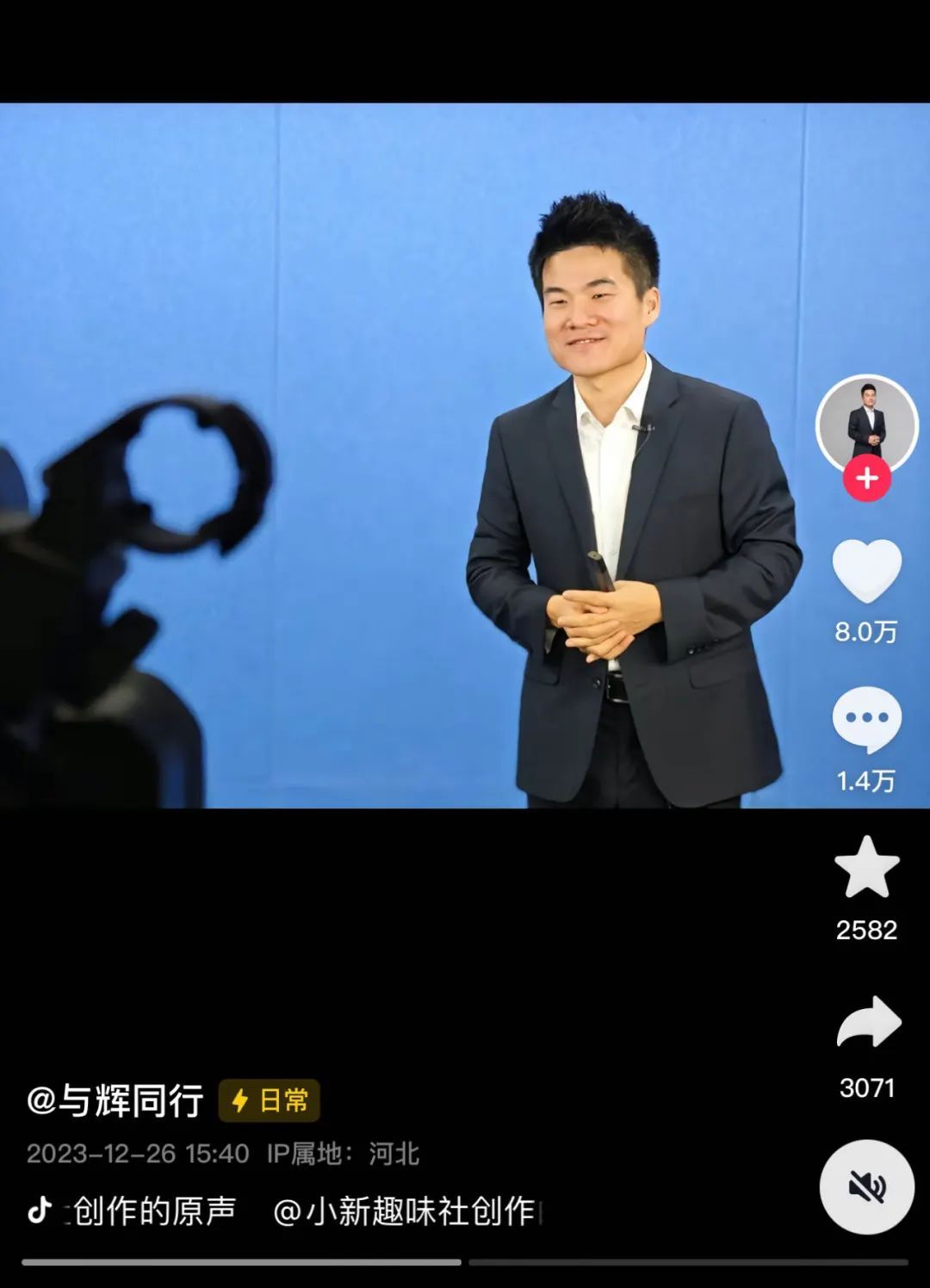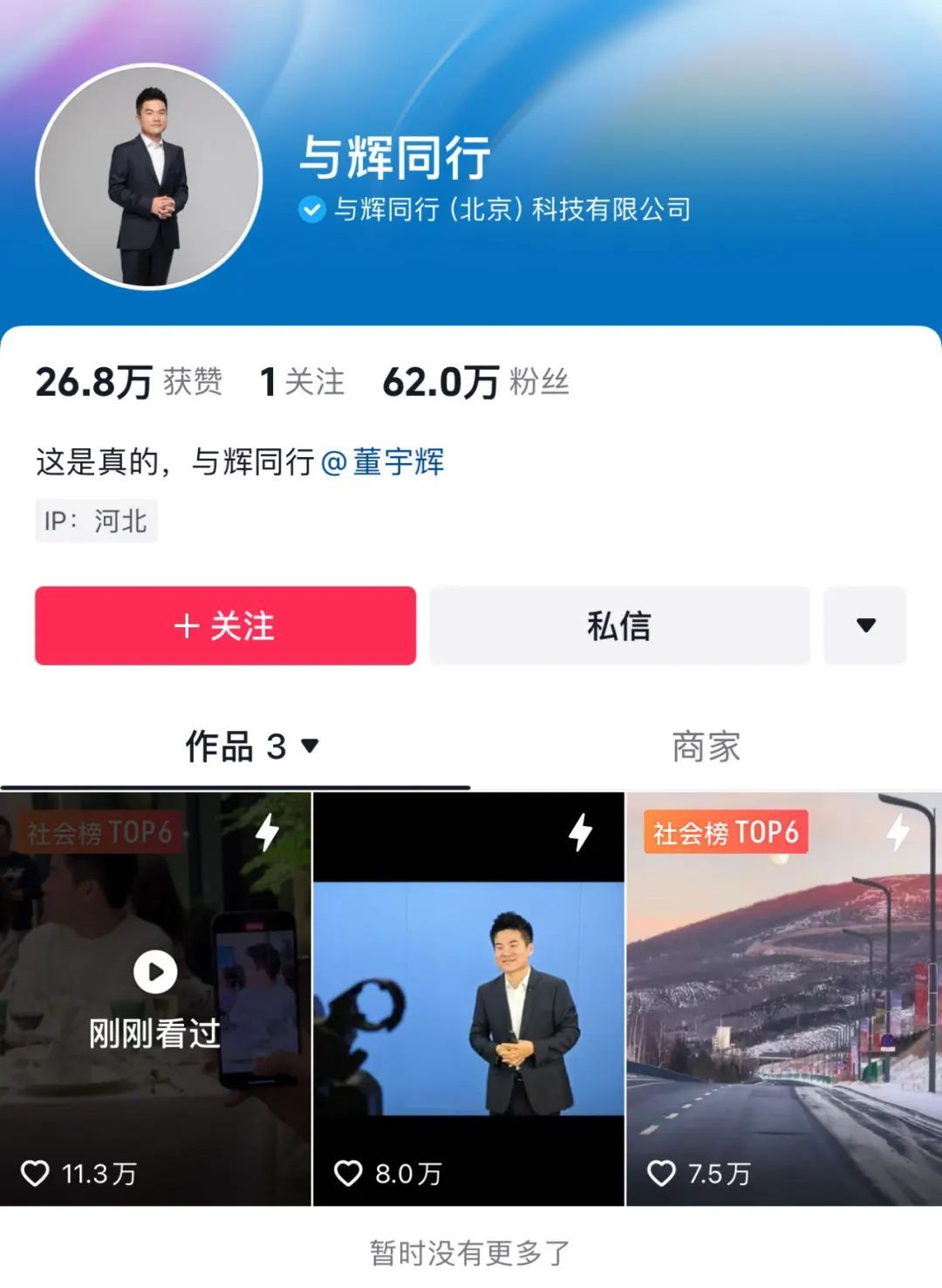 12月26日,董宇辉抖音新账号“与辉同行”正式开通,已获平台官方认证,企业认证为与辉同行(北京)科技有限公司。