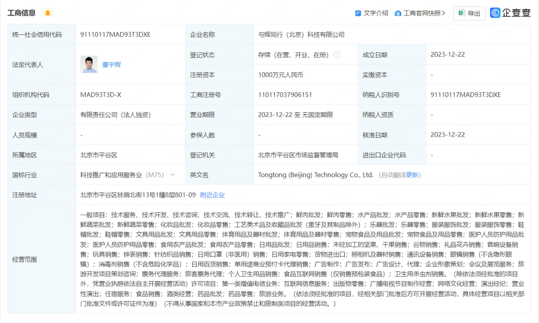 企查查显示,与辉同行(北京)科技有限公司于2023年12月22日成立,注册资本1000万元,法定代表人为董宇辉,俞敏洪担任监事,同时也是受益所有人,最终受益股份99%。