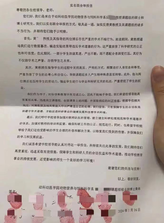 学生联名实名举报导师存在学术不端行为。举报信显示,多名自称是动科动医学院动物营养与饲料科学系黄某某教授课题组的硕士和博士研究生,实名联合举报黄某某及其课题组的诸多不当行为,其中包括“逼迫学生进行数据篡改、编造实验结果等违反学术道德的行为”,以及对学生进行“人身攻击和辱骂”。
