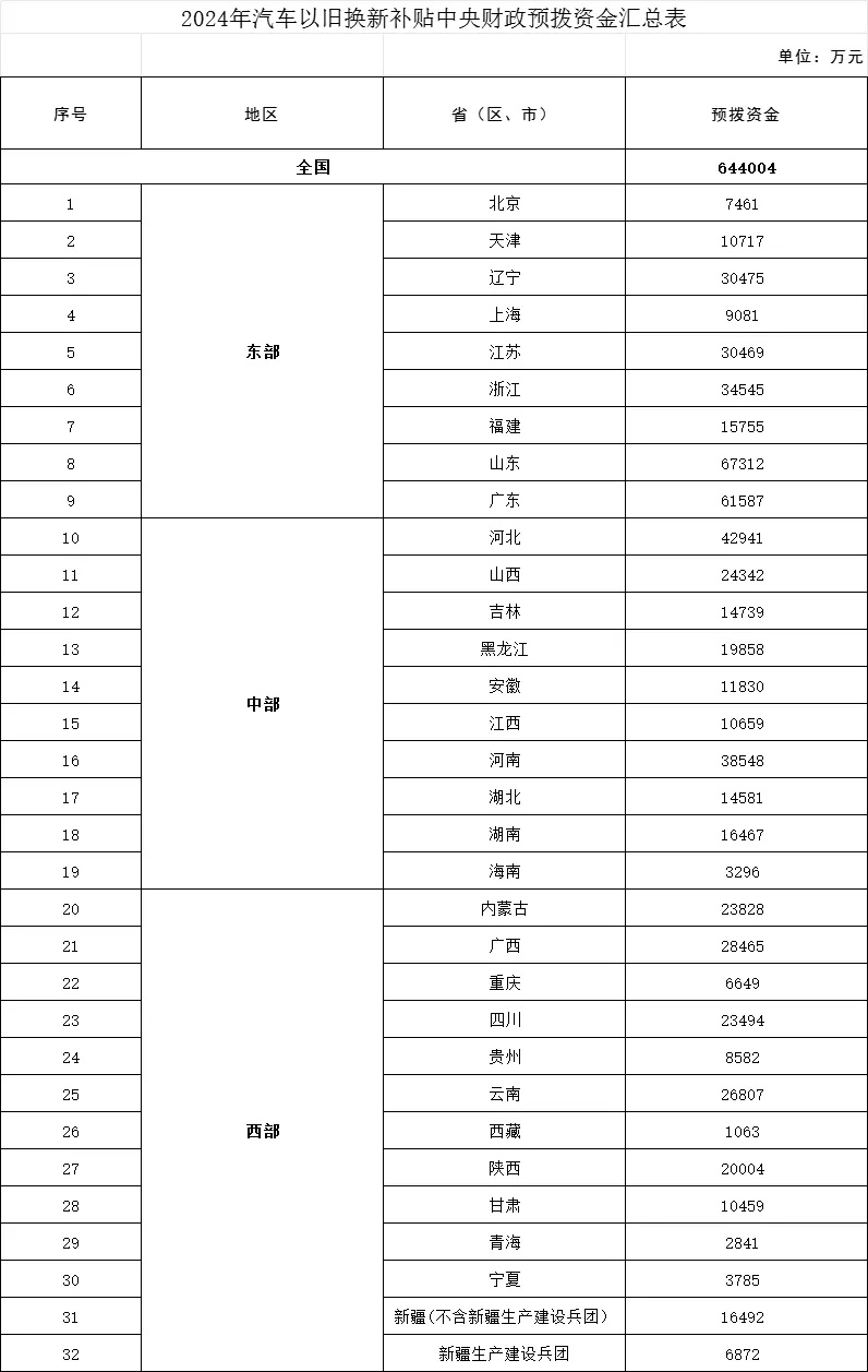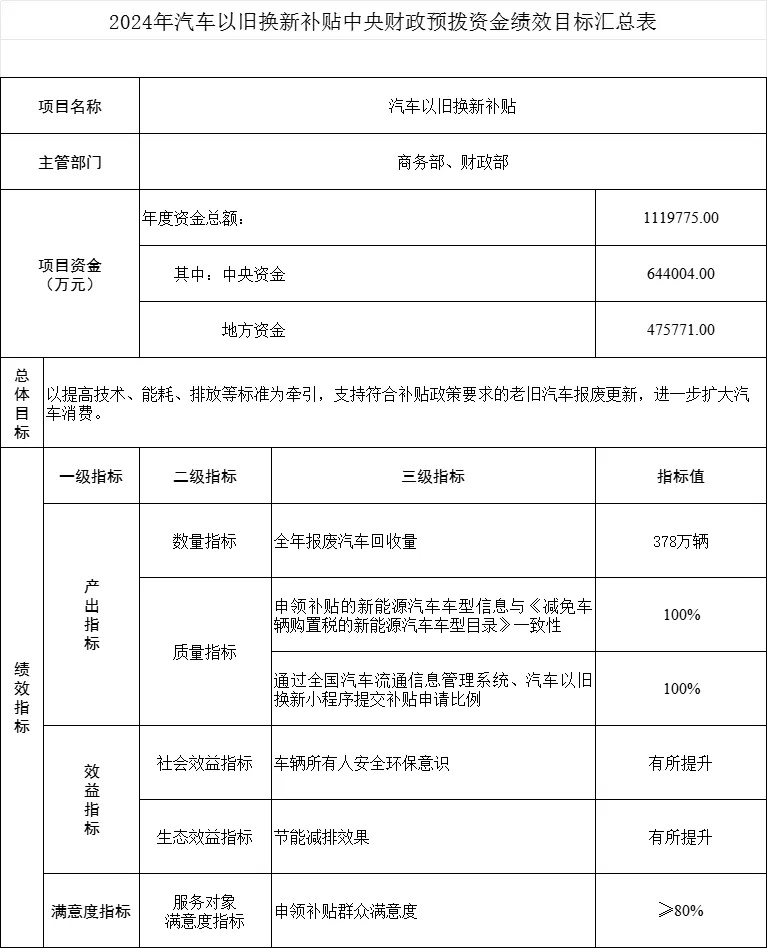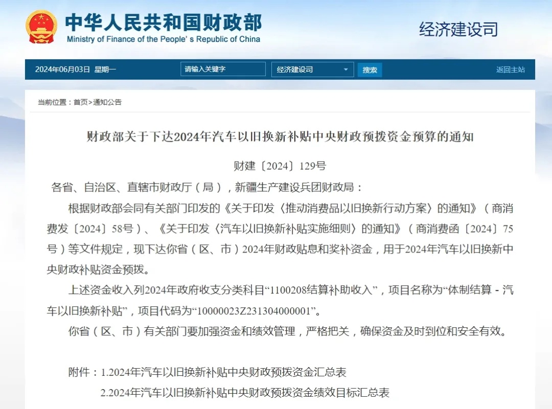 2024年5月31日,财政部在其网站上发布《财政部关于下达2024年汽车以旧换新补贴中央财政预拨资金预算的通知》(以下简称《通知》)。