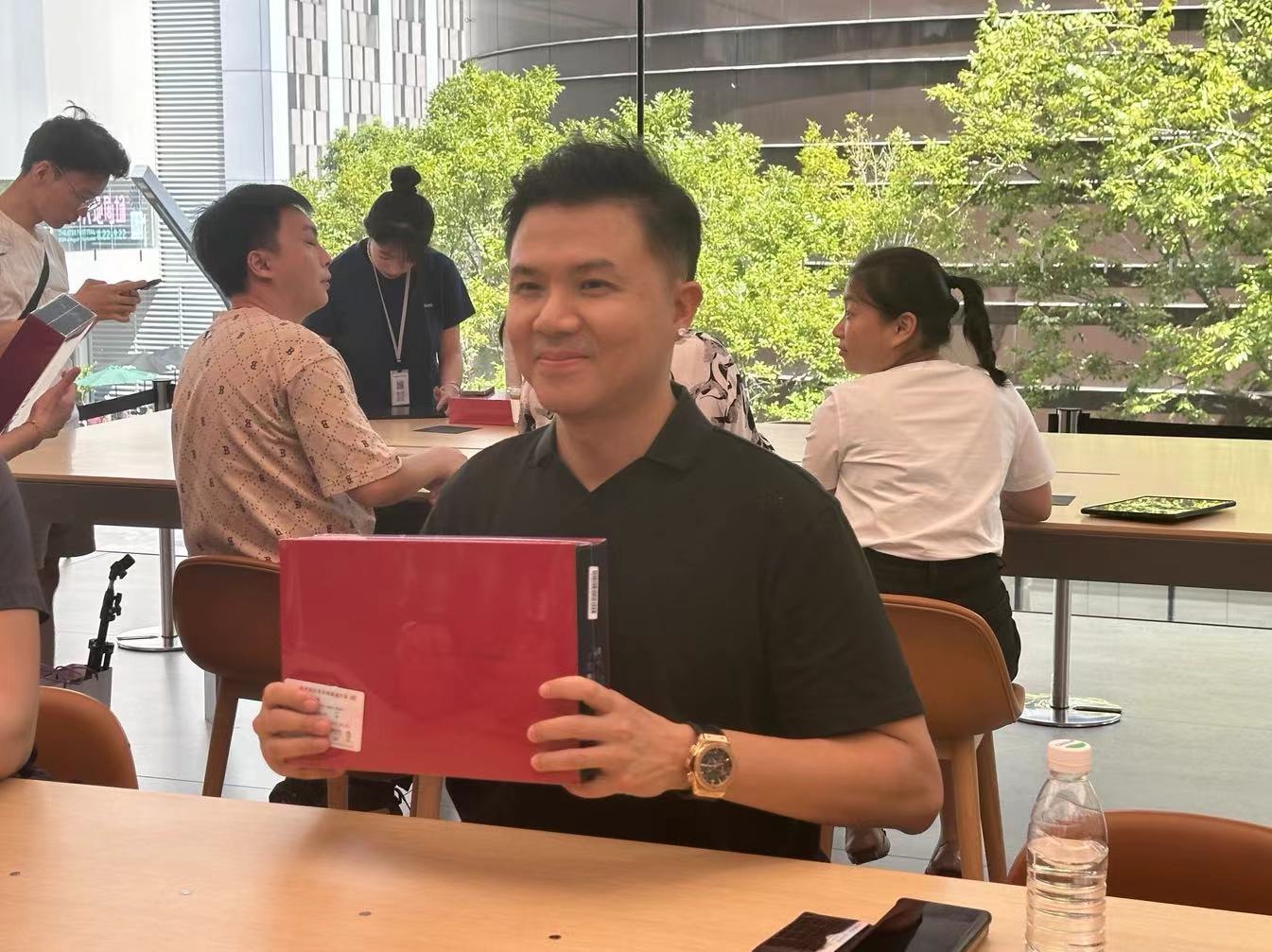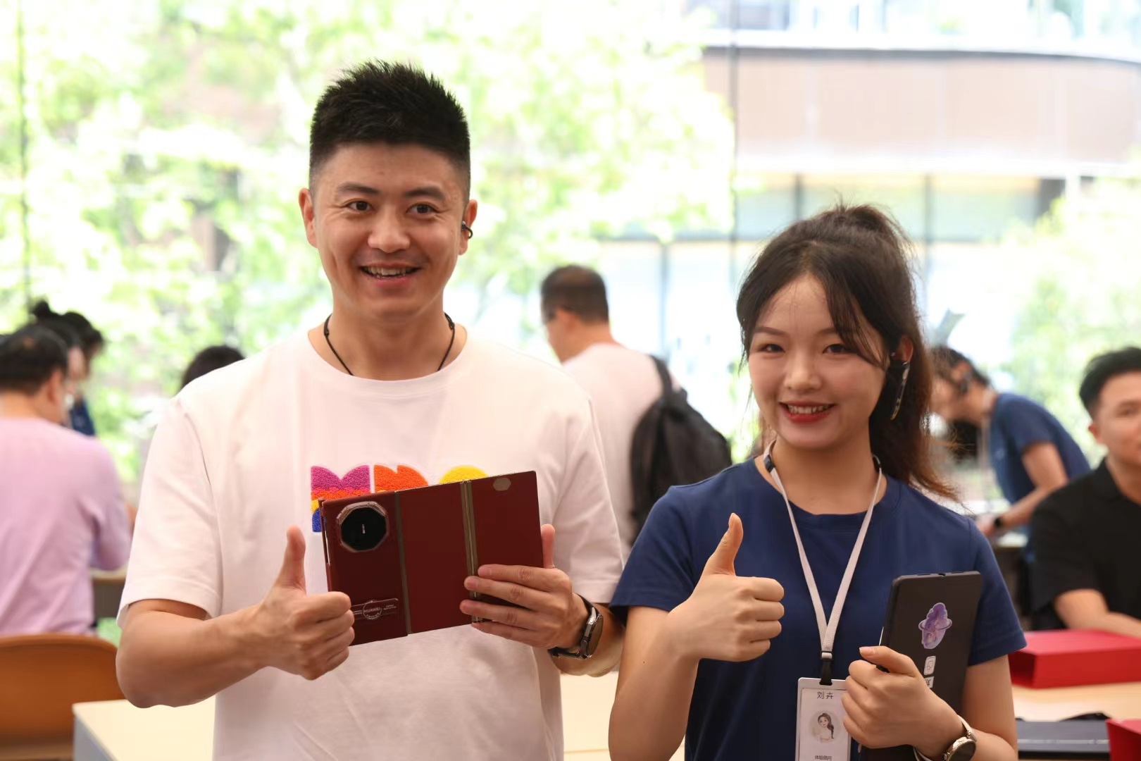 9月20日,首批用户现场领取预约到的华为三折叠屏手机Mate XT非凡大师。