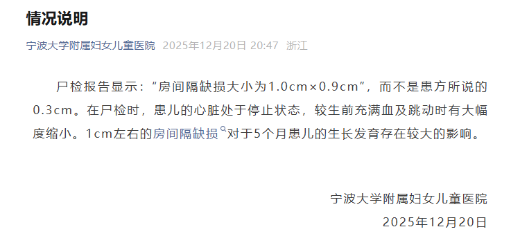 宁波大学附属妇女儿童医院12月20日发布情况声明: