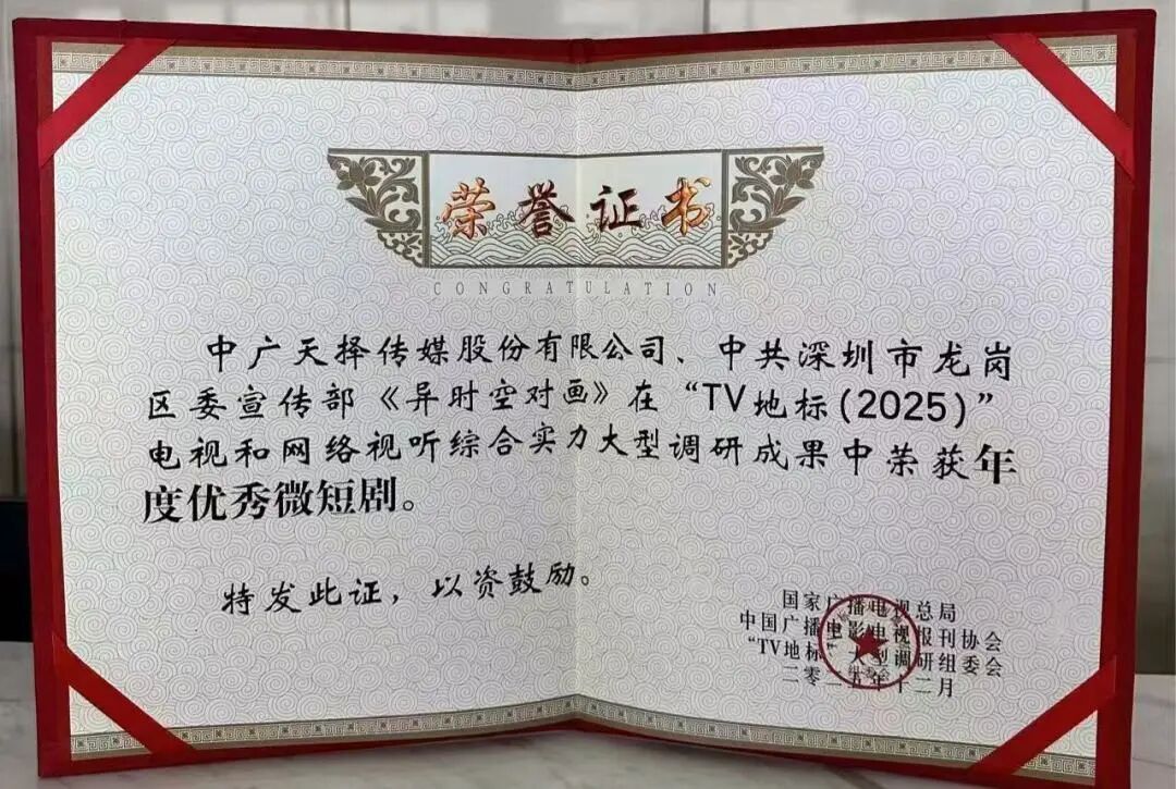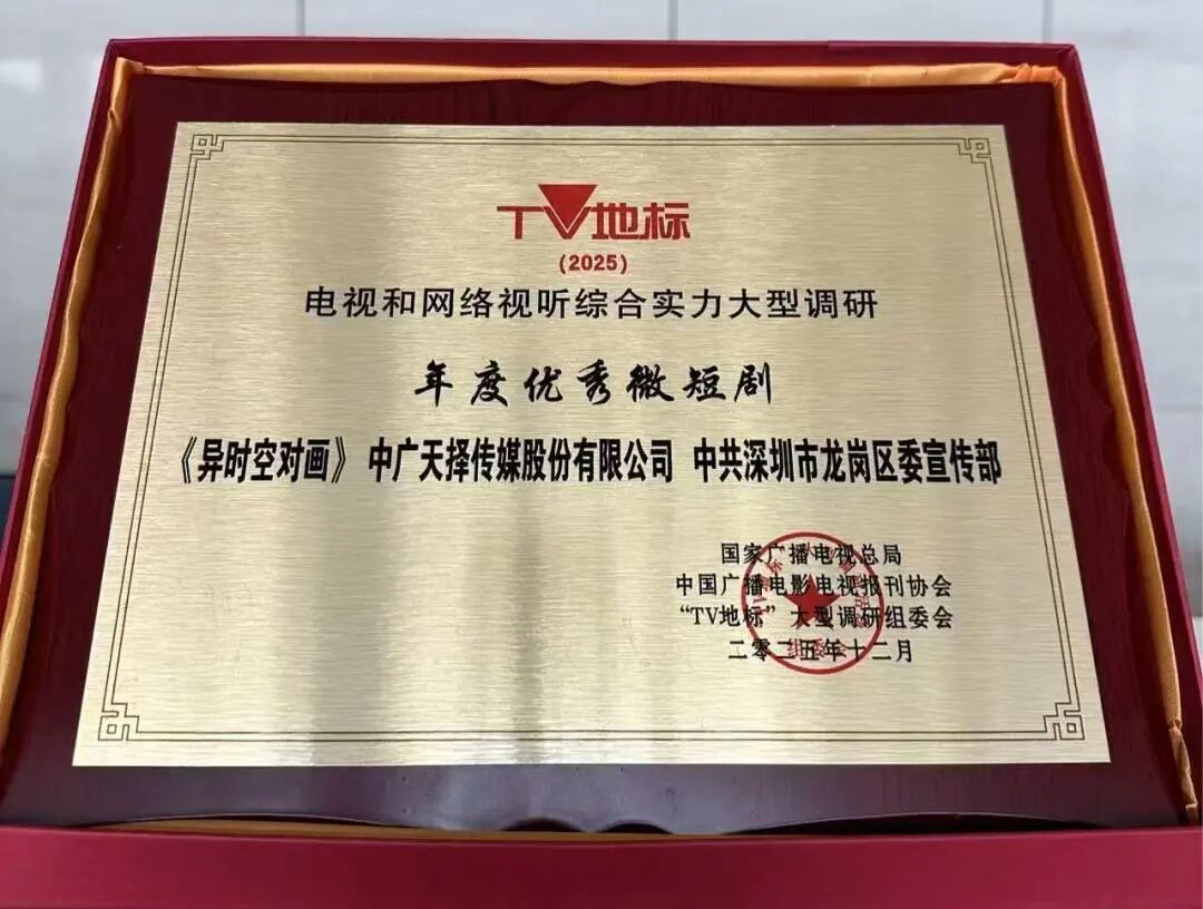 12月19日,“TV地标(2025)”电视和网络视听暨“时代之声”广播业综合实力大型调研成果发布会在北京举行。当天揭晓“TV地标(2025)”电视和网络视听综合实力大型调研榜单,其中,由龙岗区委宣传部和中广天择共同出品的微短剧《异时空对画》,获国家广播电视总局颁发的“年度优秀微短剧”奖。