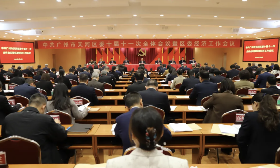 1月14日,中国共产党广州市天河区第十届委员会第十一次全体会议暨区委经济工作会议召开,总结2025年工作,分析当前形势,部署2026年工作。区委常委会主持会议。区委书记谭明鹤代表区委常委会作报告,区委副书记、区长陈建荣就经济工作作具体部署。