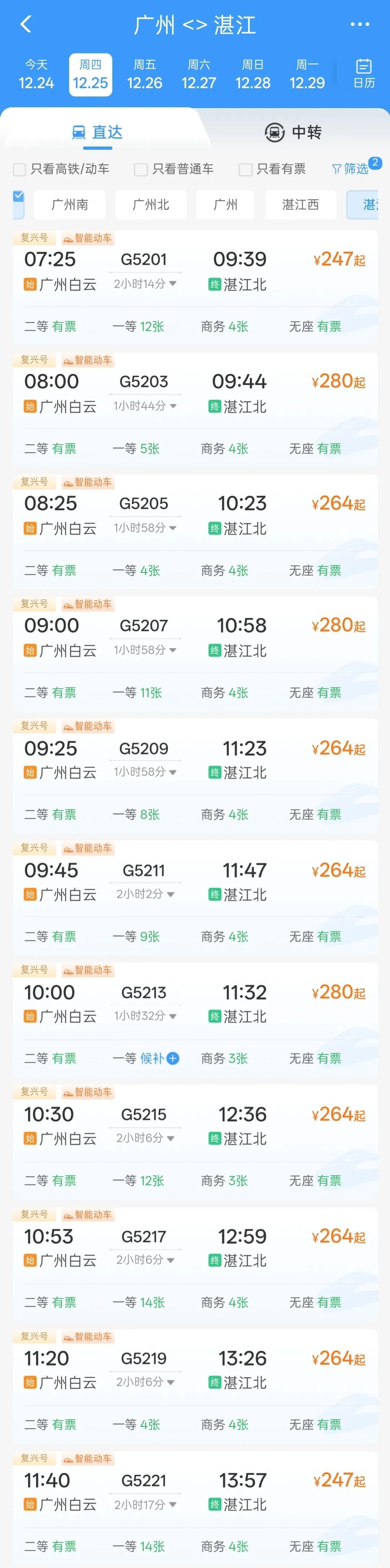 据12306手机客户端显示,12月25日广州白云站到湛江北站二等座最高280元,最低247元。旅客可根据时间安排及出行需要购票,具体票价信息请通过12306手机客户端查询。