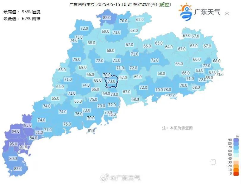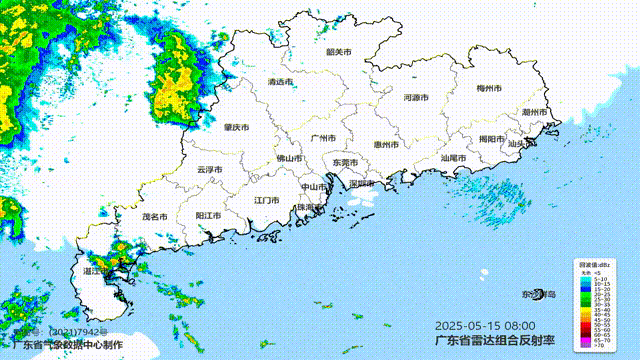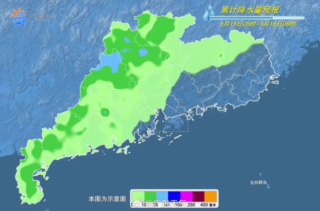 5月15日,韶关、清远、粤西和珠江三角洲西部市县多云间阴天,有(雷)阵雨,局部暴雨,其余市县多云,局部有(雷)阵雨。最高气温:东部市县31℃~33℃,其余市县29℃~31℃。