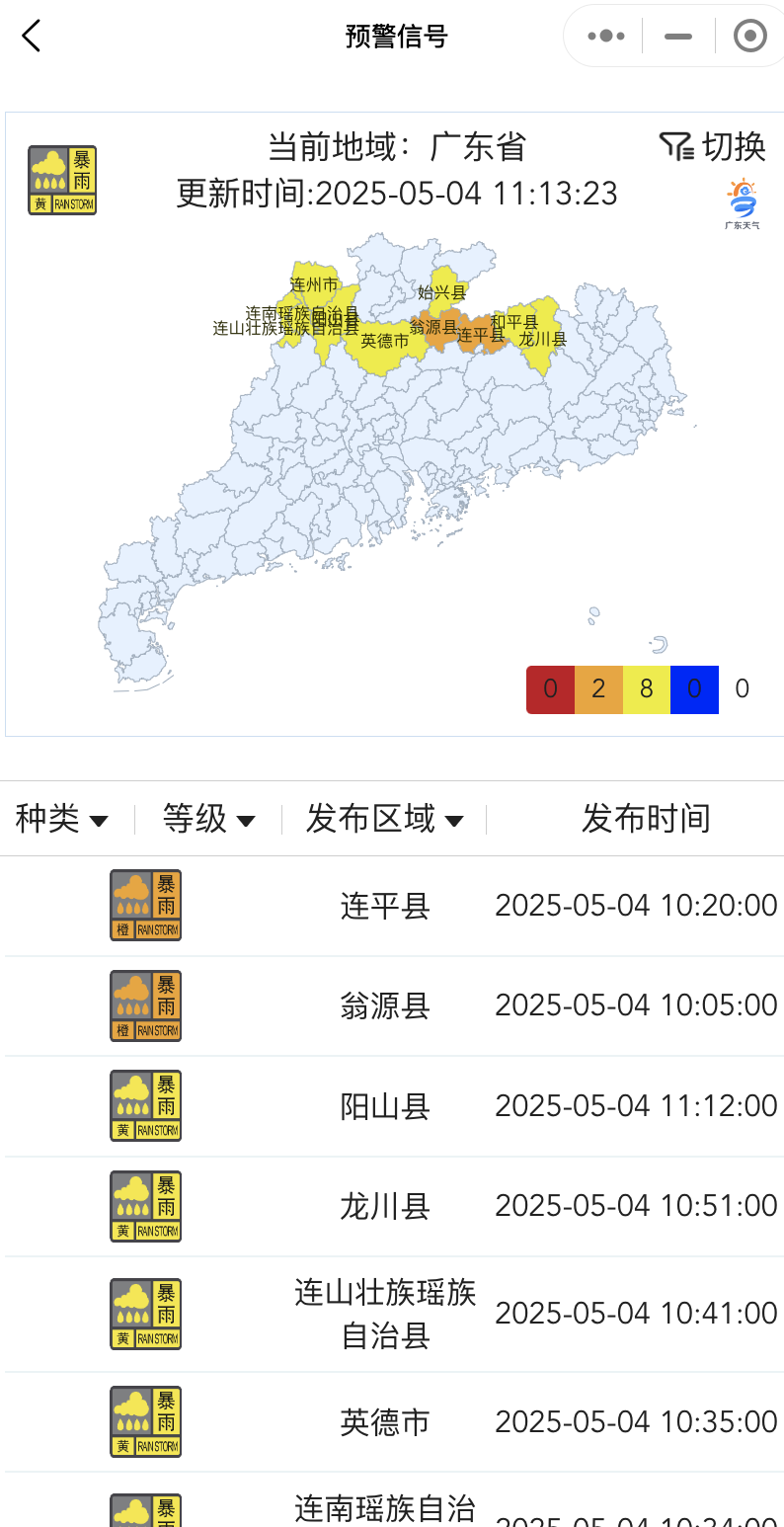 截至5月4日11时13分许,全省共有10个暴雨预警信号生效中。