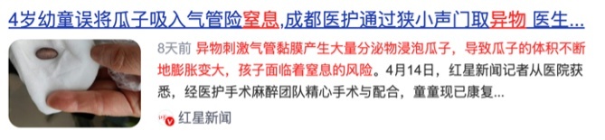 这意味着:一粒小小花生米,成人吞下去没什么大碍,却可能将孩子的气道完全堵塞住。
