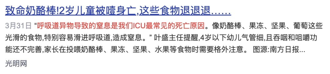 牙齿没长全、咀嚼和吞咽能力还不够强大:这会让食物还没被充分咀嚼就被囫囵吞下,很容易误入气道,引起不同程度的阻塞。