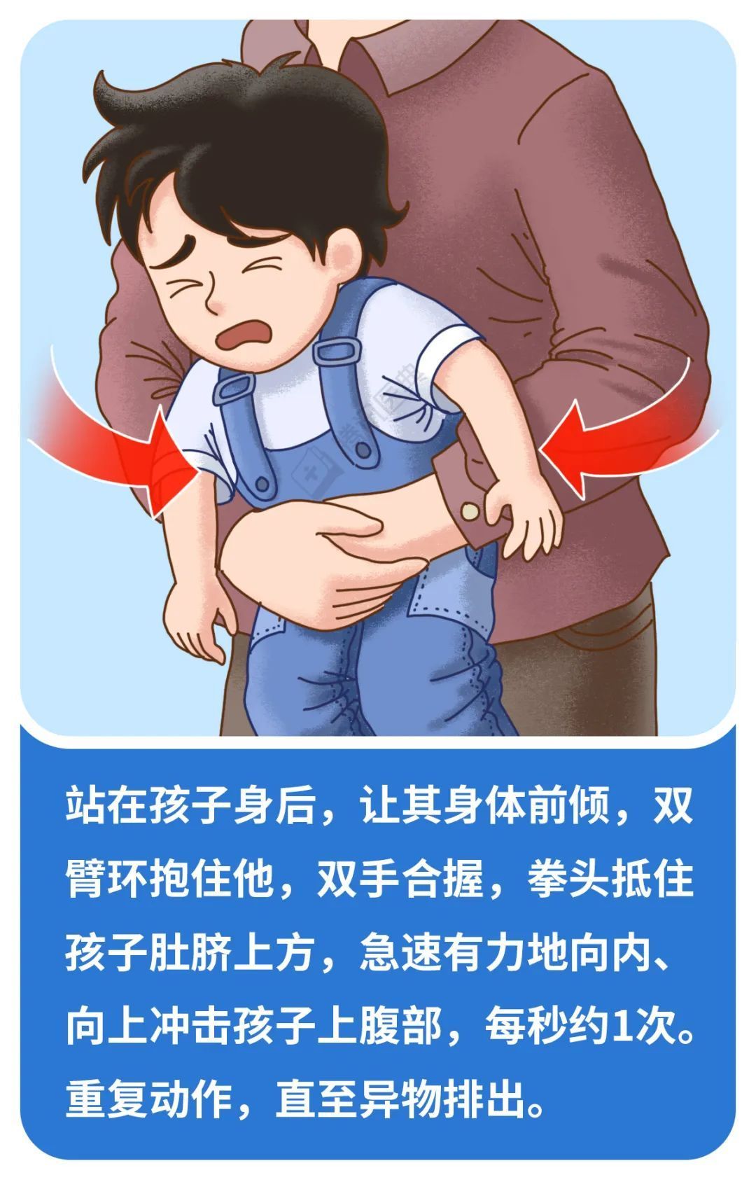 注意:一旦发现孩子意识丧失,建议改做心肺复苏术[3]。
