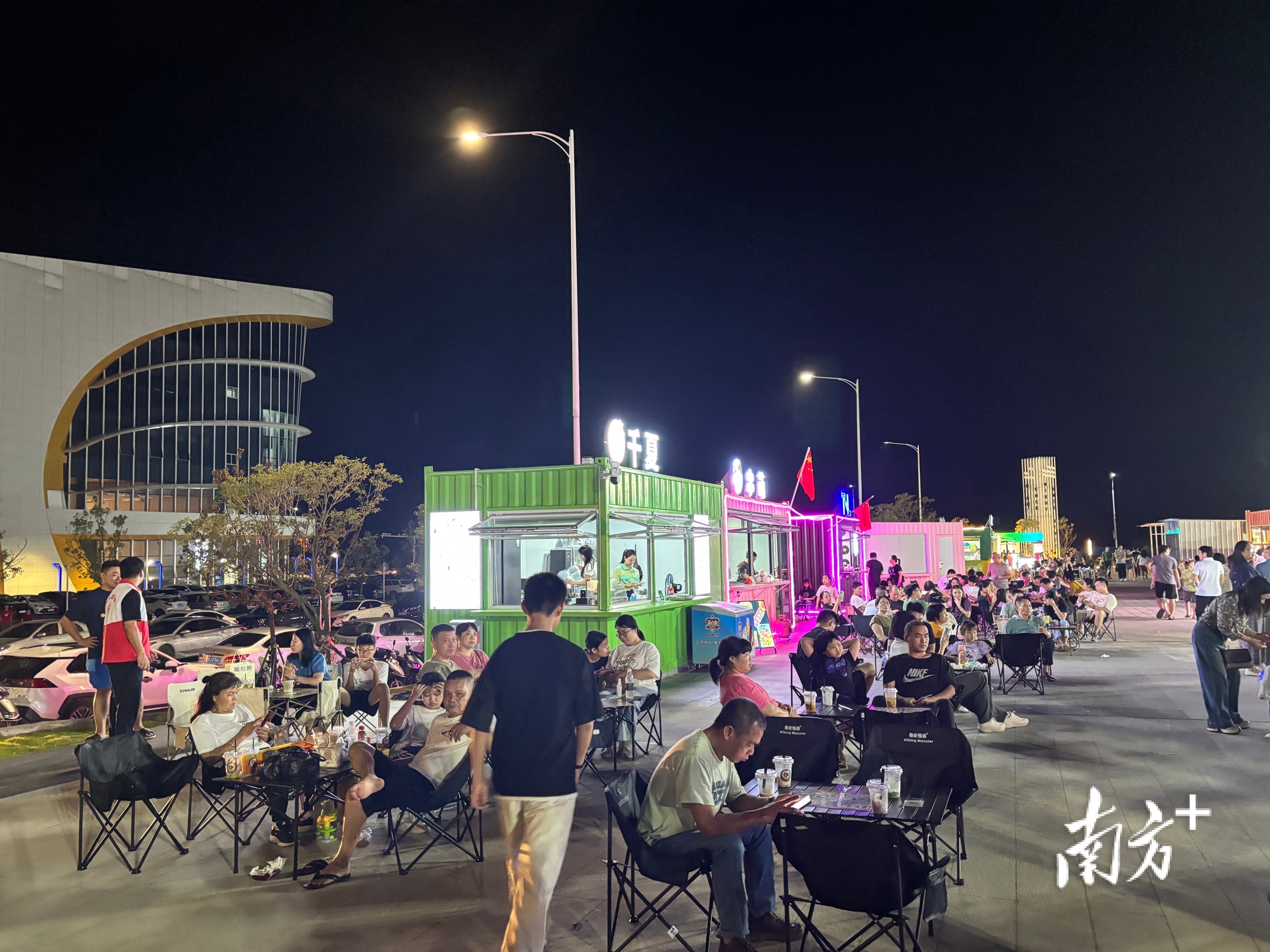 而最近蓬江最火的“网红”夜市,就是义乌小商品城附近的摩创园。这个由旧摩托车厂区转型而来的文创园区,一到夜晚就人声鼎沸,粉面摊前升腾着诱人的热气,烧烤架上食物滋滋作响,麻辣烫、炸串、奶茶等各式小吃的香味在空气中弥漫。