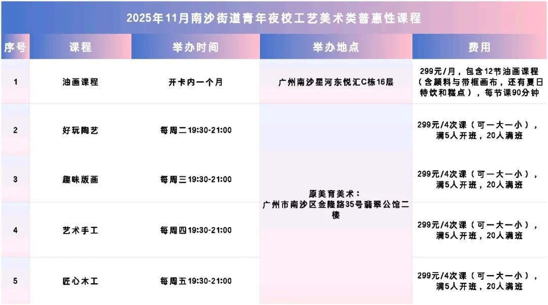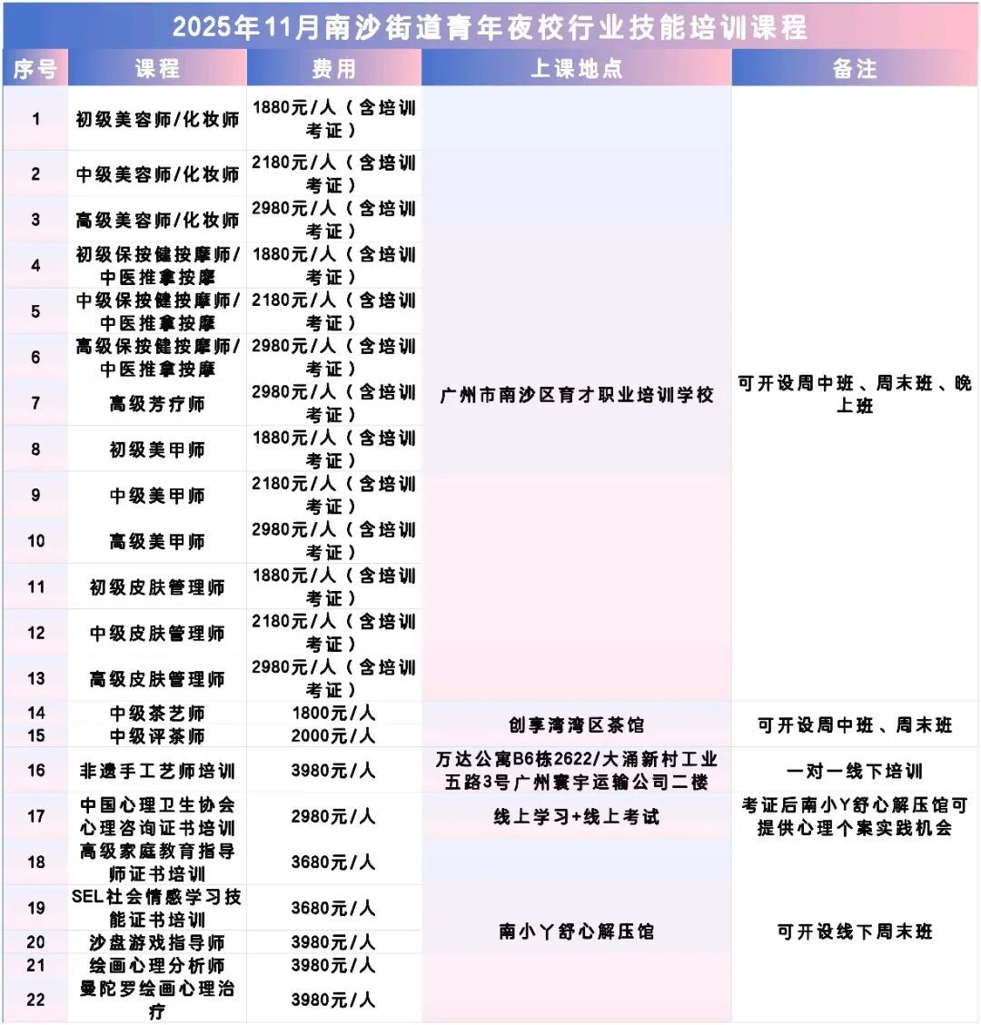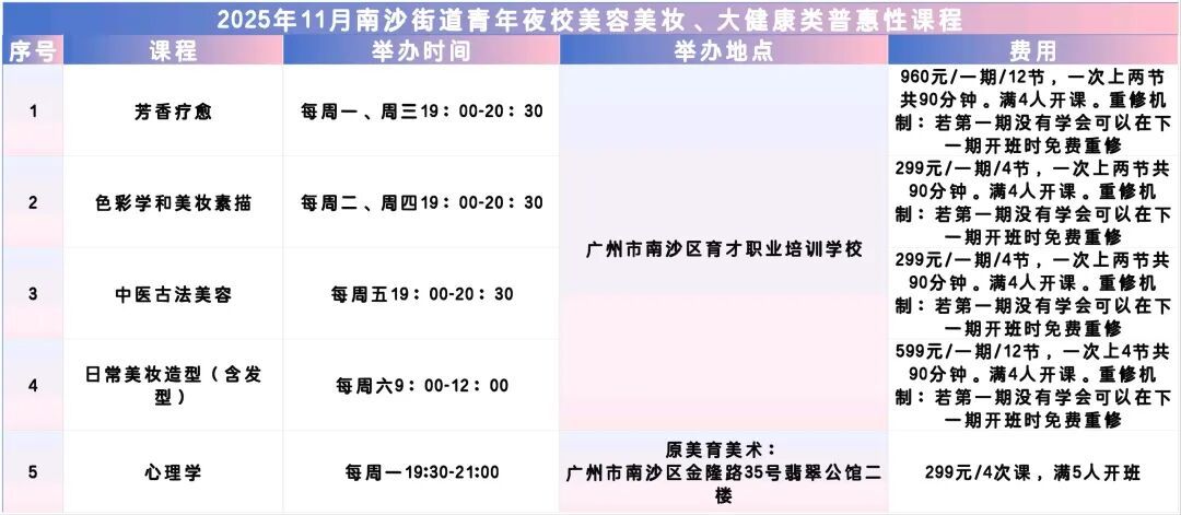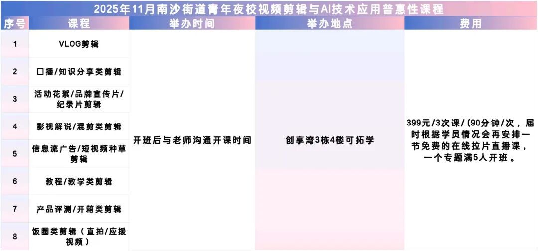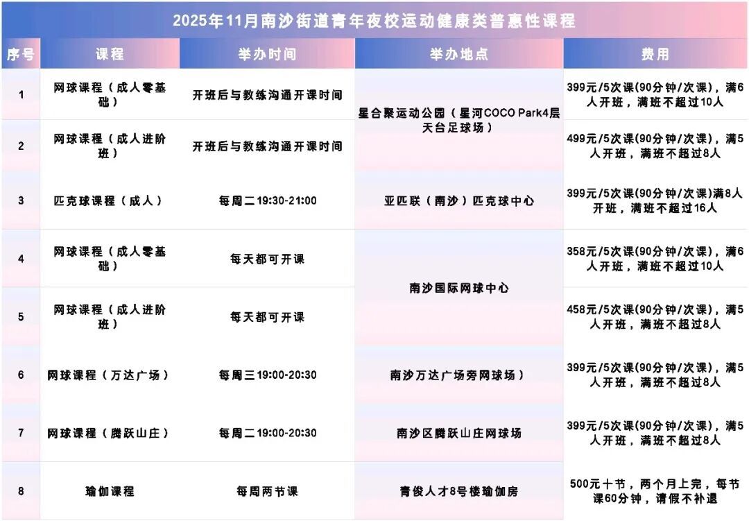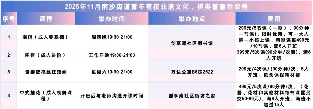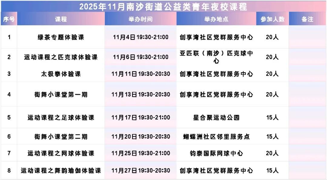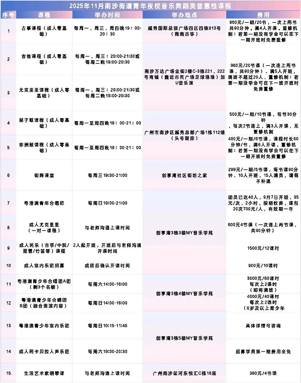 以上为公益性课程的计划开班时间,若因天气原因或其他不可抗力因素改期,工作人员将会通知报名的学员改期的时间和地点,未报名的市民请勿自行前往。若想及时获取南沙街道青年夜校的最新资讯可以关注小红书“粤港澳青年服务驿站”。