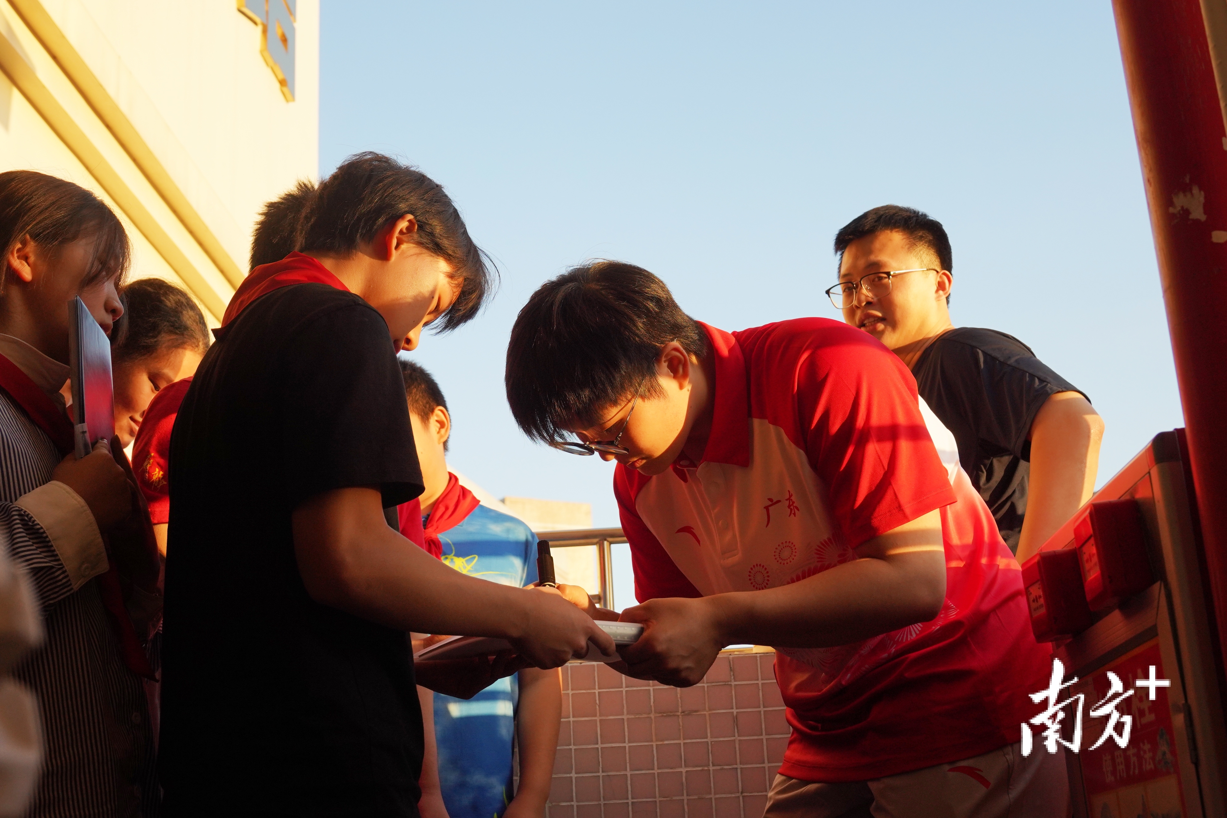 彭翠婷耐心地在体校小队员的训练笔记本上签名。薛屏 摄