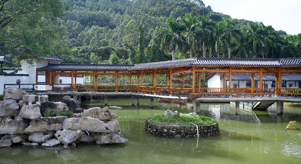 民宿位于四会市江谷镇老泗塘村,占地约35000平方米,整体建筑风格以岭南园林为主,融入农耕文化、中国红等传统文化元素,舍前院后绿树红花,布局巧妙,环境清幽,宛若世外桃源。