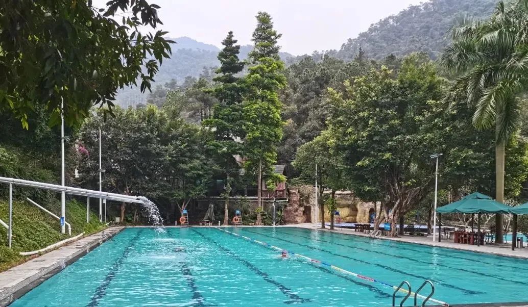 这里的泳池由山泉水汇聚而成,水质澄澈见底。其中,两个大泳池供大人畅游,释放活力,一个娃娃池专为小朋友打造,充满童趣。