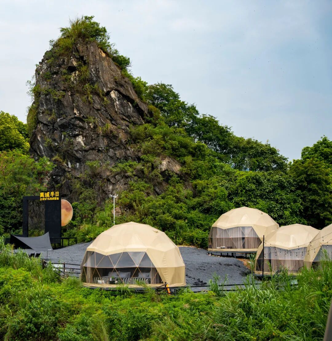 离城半日矿坑月球营地绝对是一处能让你暂别城市喧嚣、拥抱独特自然与趣味体验的宝藏之地。营地坐落于石寨村古树公园内,周边环绕着广东十大最美古树群之一,118棵超百年树龄的仁面果树郁郁葱葱,与500年历史的石寨村落相映成趣,古朴又充满生机。