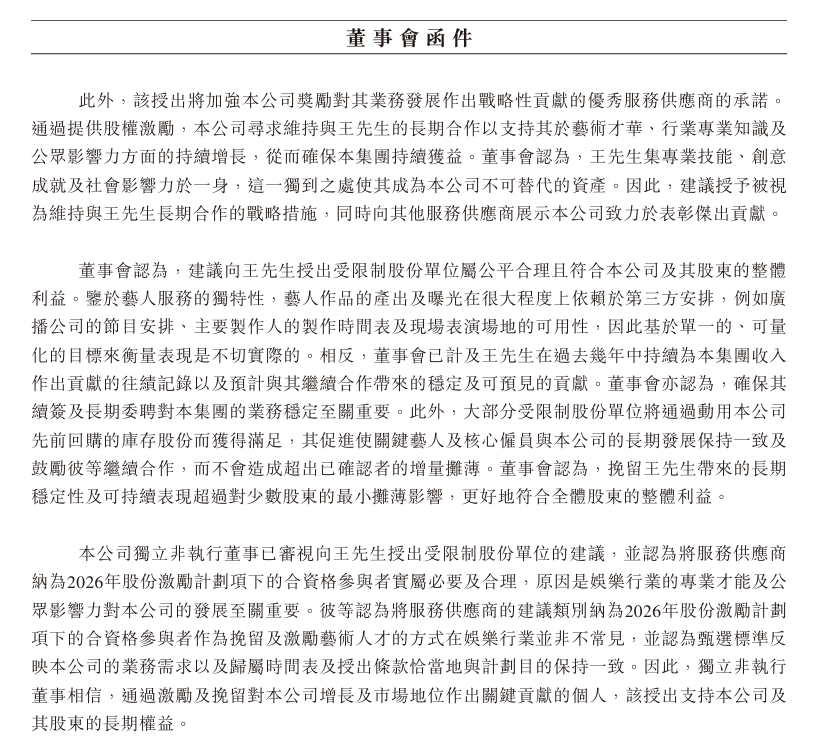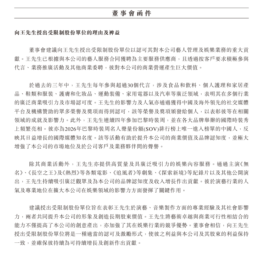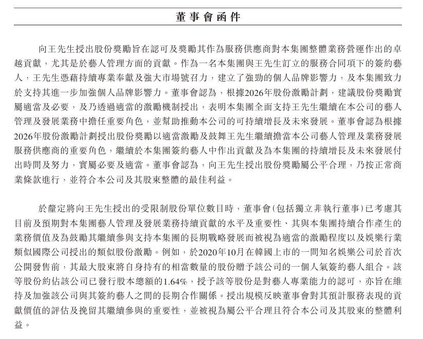 董事会认为,挽留王一博带来的长期稳定性及可持续表现超过对少数股东的最小摊薄影响,更好符合全体股东的整体利益。