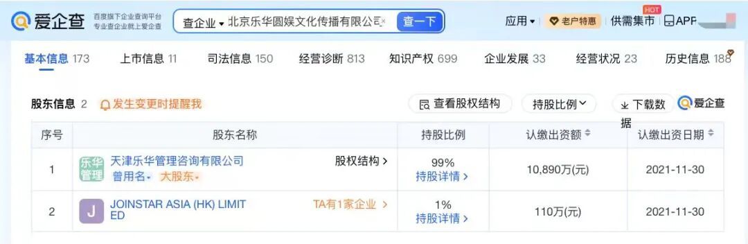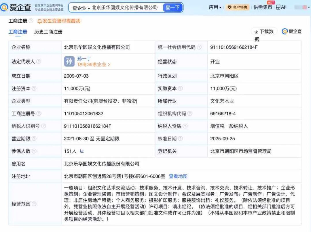 爱企查App显示,乐华娱乐的主体公司北京乐华圆娱文化传播有限公司成立于2009年7月,法定代表人为孙一丁,杜华任该公司执行董事,注册资本1.1亿元人民币,经营范围包括组织文化艺术交流活动、技术推广服务、投资咨询、影视策划、包装装潢设计等,由天津乐华管理咨询有限公司等共同持股。