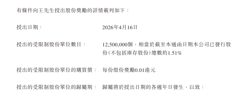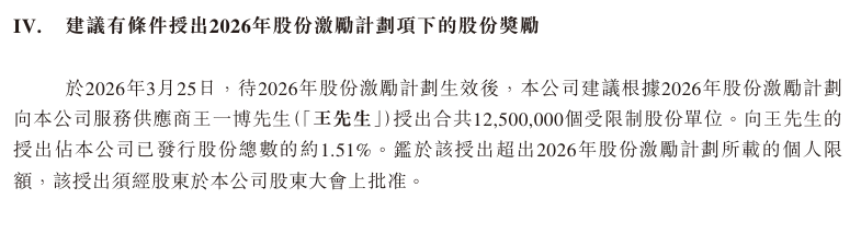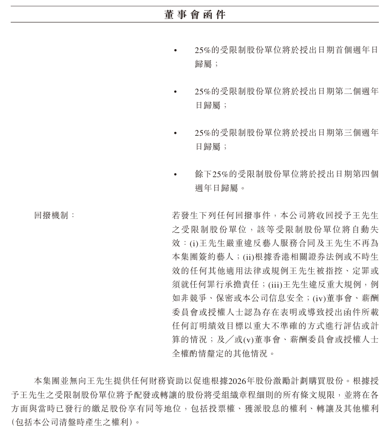 此次授出因超出个人获授股份奖励上限(已发行股本的1%),需获得股东于股东特别大会上的批准。授出股份的归属期设定为四年,每年归属25%。公告明确,若王一博发生严重违约、被定罪、违反保密或非竞争条款等情况,已授出的股份单位将自动失效。