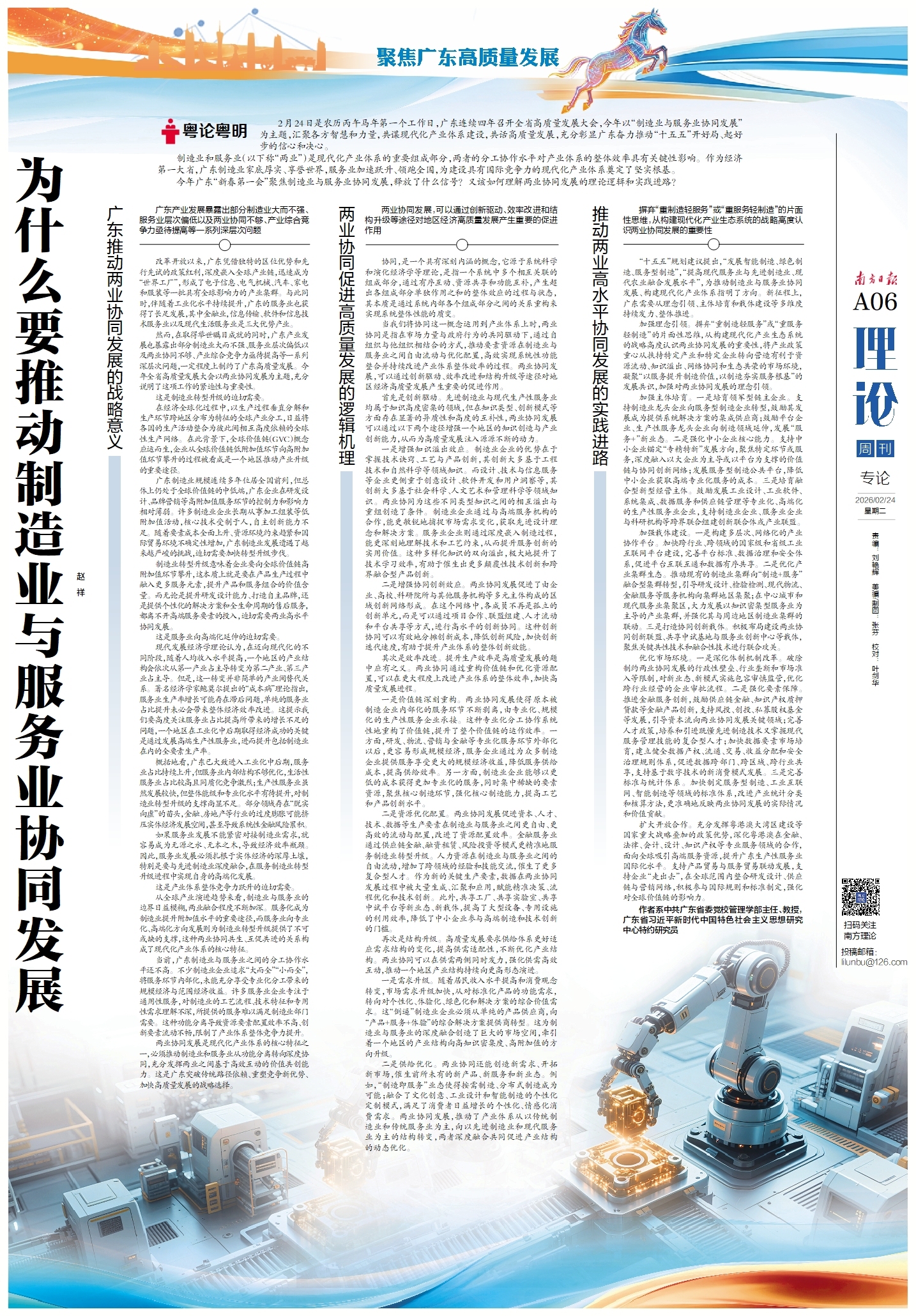2月24日是农历丙午马年第一个工作日,广东连续四年召开全省高质量发展大会,今年以“制造业与服务业协同发展”为主题,汇聚各方智慧和力量,共谋现代化产业体系建设,共话高质量发展,充分彰显广东奋力推动“十五五”开好局、起好步的信心和决心。