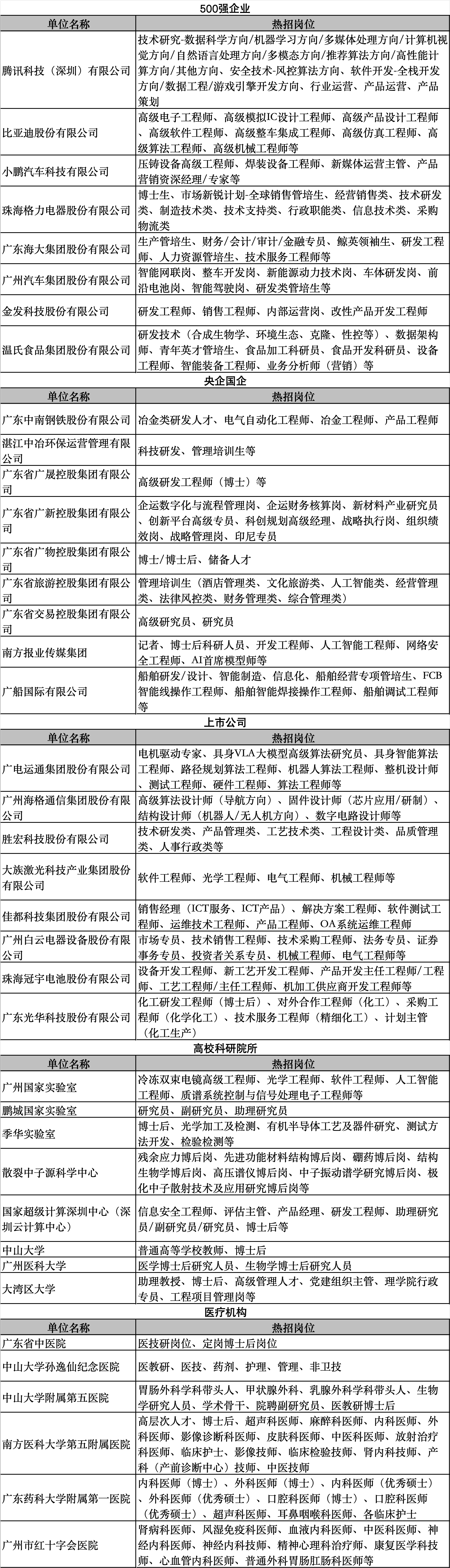 用人单位层次类别丰富多元,比亚迪、小鹏、广汽、腾讯、格力等500强企业及其子公司超150家,南方电网、华润集团、招商集团、广晟控股、广新控股、广州数科、越秀集团等央国企超170家,优必选、唯品会、海格通信、胜宏科技、大族激光等上市公司超170家,广州国家实验室、鹏城国家实验室、中山大学等高校科研院所超110家,中山大学系列医院、南方医科大学系列医院、广州医科大学系列医院等医疗机构超70家。