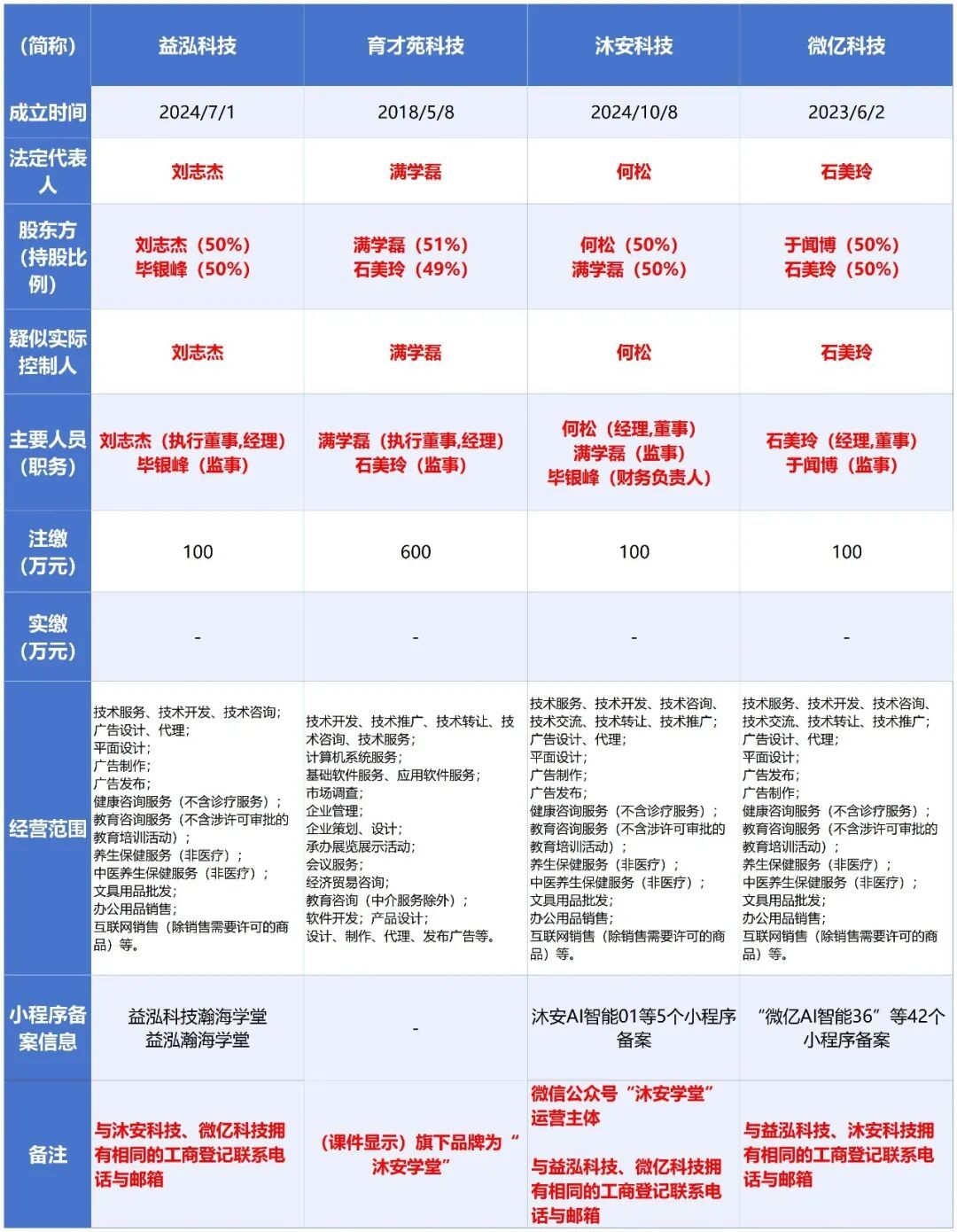 “给学员看时,发的营业执照是育才苑科技,但收我父亲款的却是益泓科技。为什么会不一样?益泓科技、育才苑科技、沐安学堂、微亿智能科技(群里‘老师’企业微信备注单位名)这几个主体到底是什么关系?”李明不禁问道。