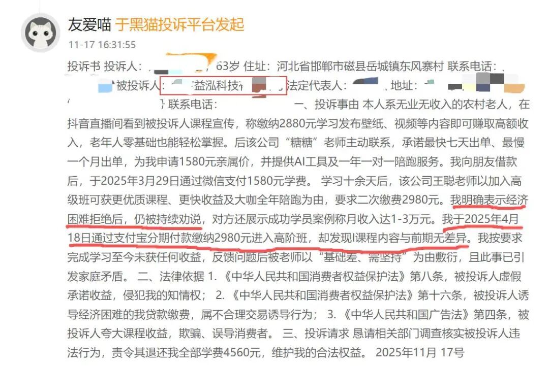 投诉平台显示,有老年投诉人称,自己无业无收入,在直播间看到益泓科技宣传“发壁纸、视频等内容即可赚取高额收入”“老年人零基础也能轻松掌握”的内容后,向朋友借款支付1580元学费,随后对方提出缴费2980元可加入高阶班,该位老人明确拒绝,表示经济困难,但对方仍持续“劝说”。最终老人于2025年4月18日通过网贷分期付款的方式缴纳2980元,进入益泓科技宣称的“高阶班”,但发现课程内容与前期无差异。