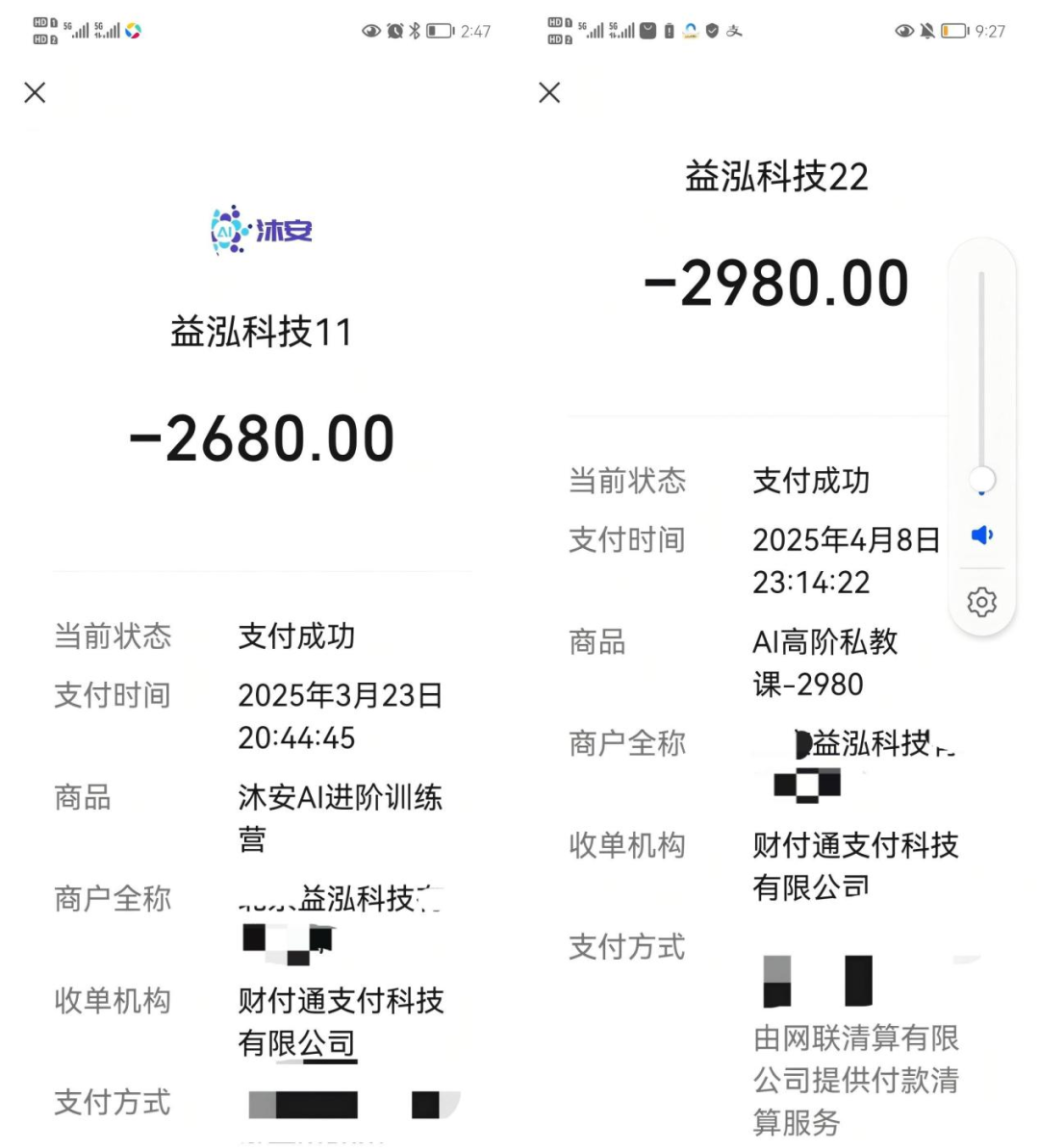 ▲2025年3月23日、4月8日,李明父亲向益泓科技支付合计5660元AI相关课程学费的支付凭证。受访者供图