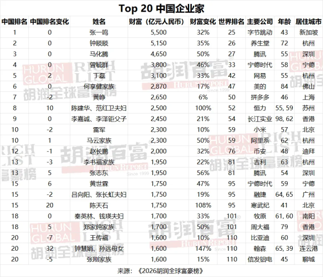 2026胡润富豪榜出炉,张一鸣成中国首富