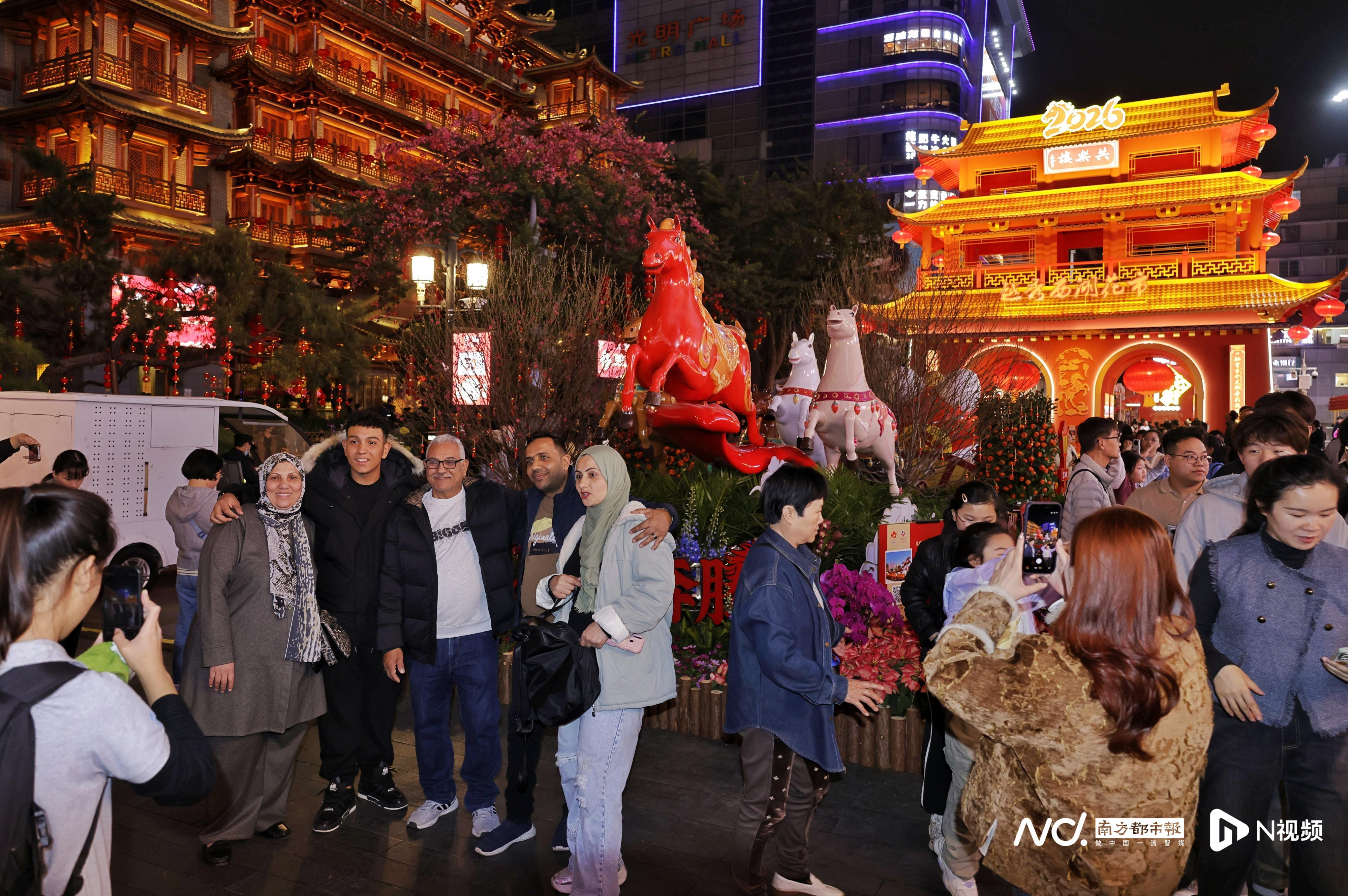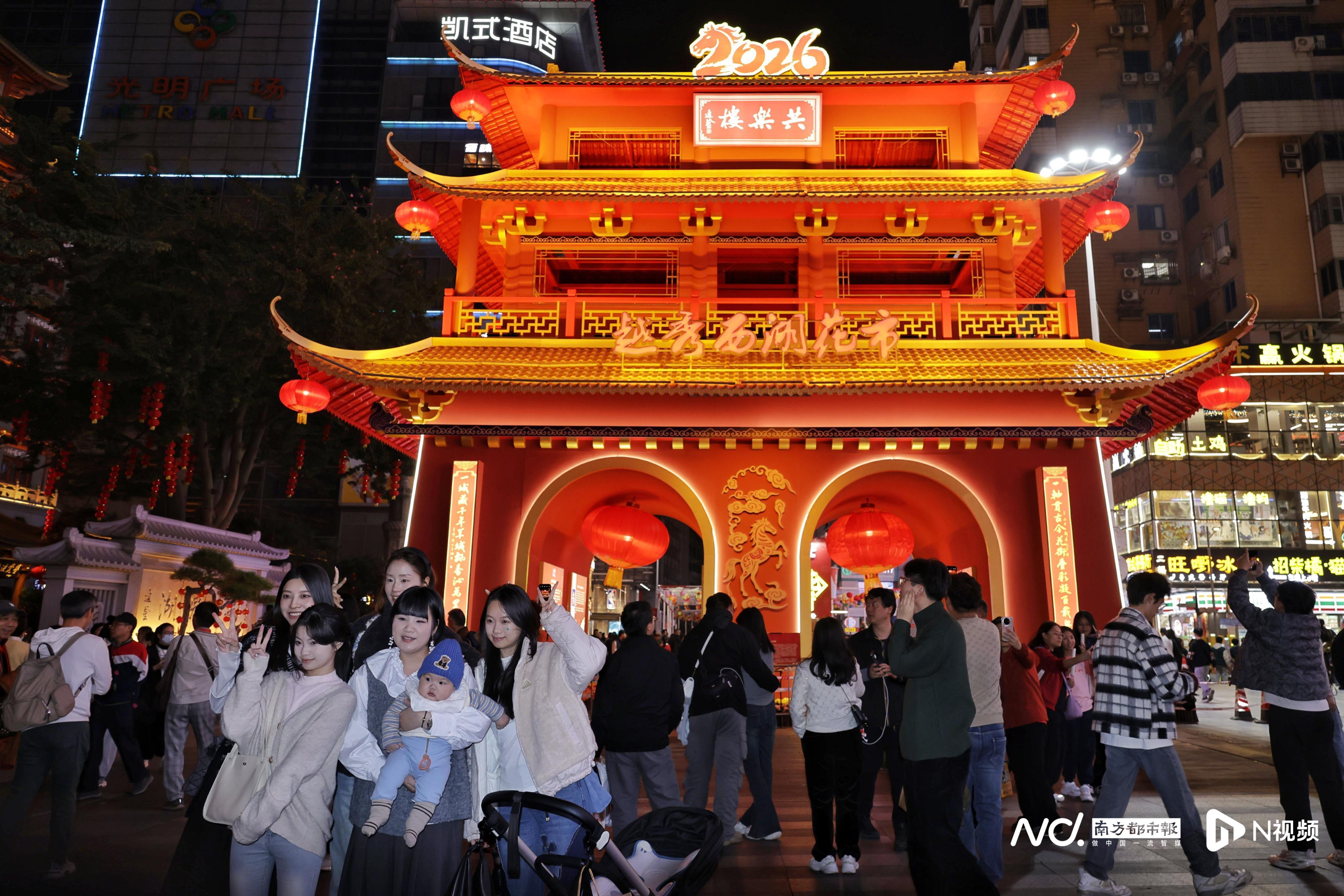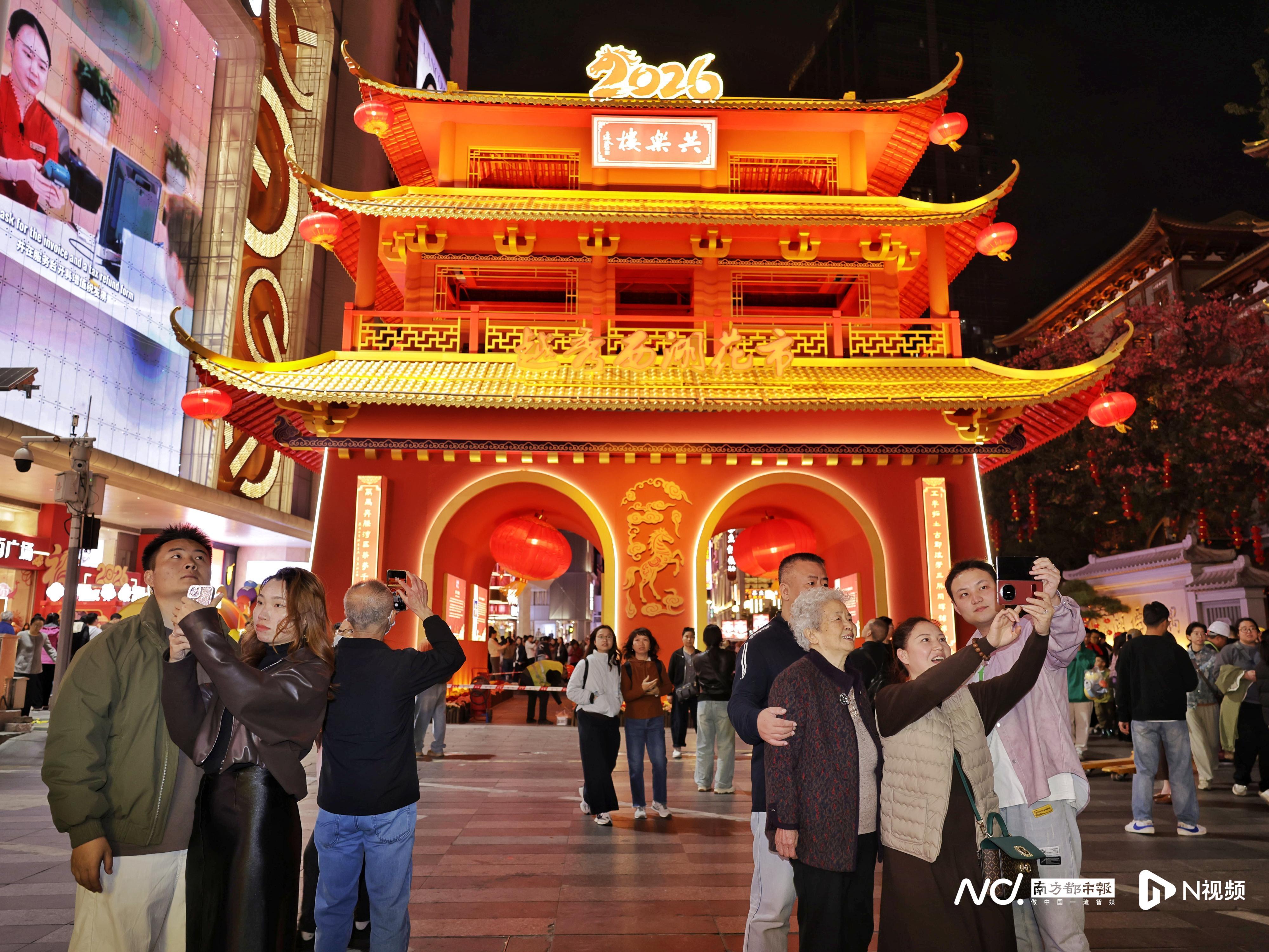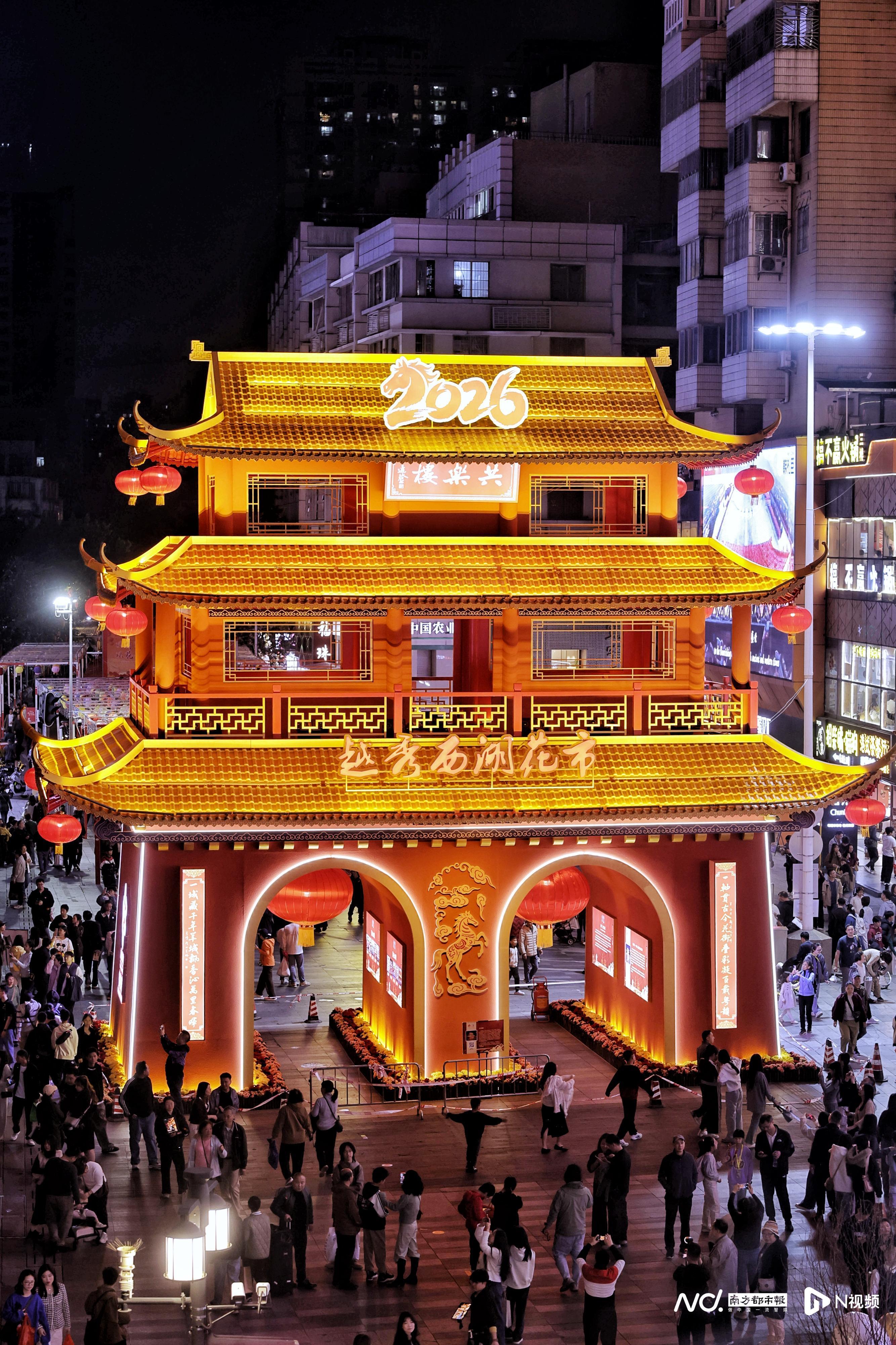 2月11日晚,2026年广州越秀西湖花市主牌楼试亮灯,路过的市民游客们纷纷驻足打卡拍照留念。今年越秀西湖花市将于2月13日(腊月廿六)上午8:30开始,持续至2月17日(年初一)凌晨2:00。