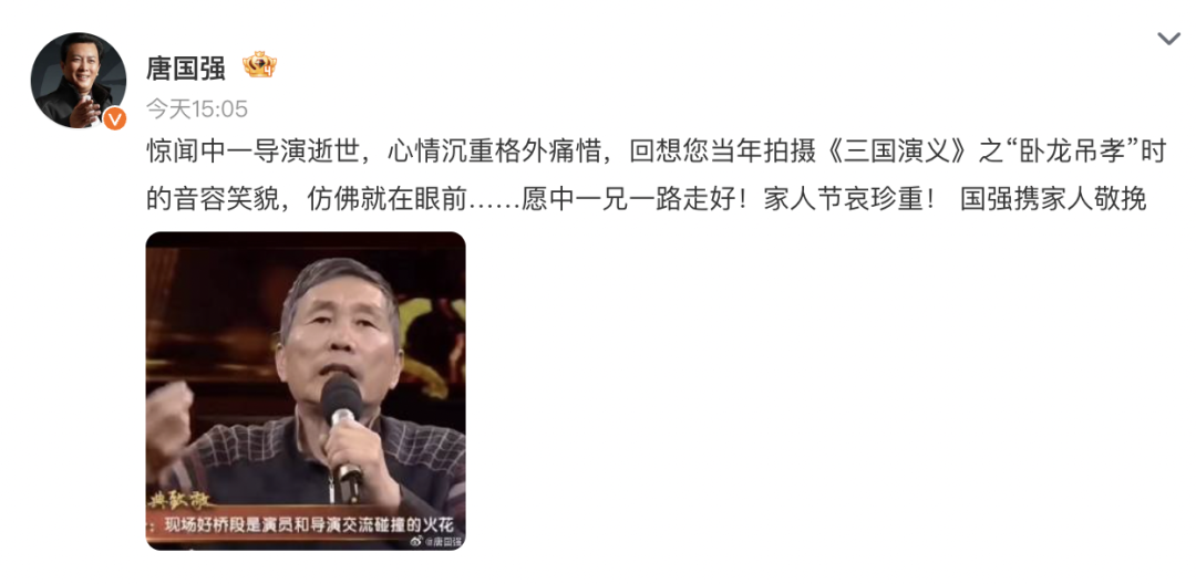 惊闻中一导演逝世,心情沉重格外痛惜,回想您当年拍摄《三国演义》之“卧龙吊孝”时的音容笑貌,仿佛就在眼前……愿中一兄一路走好!家人节哀珍重! 国强携家人敬挽。