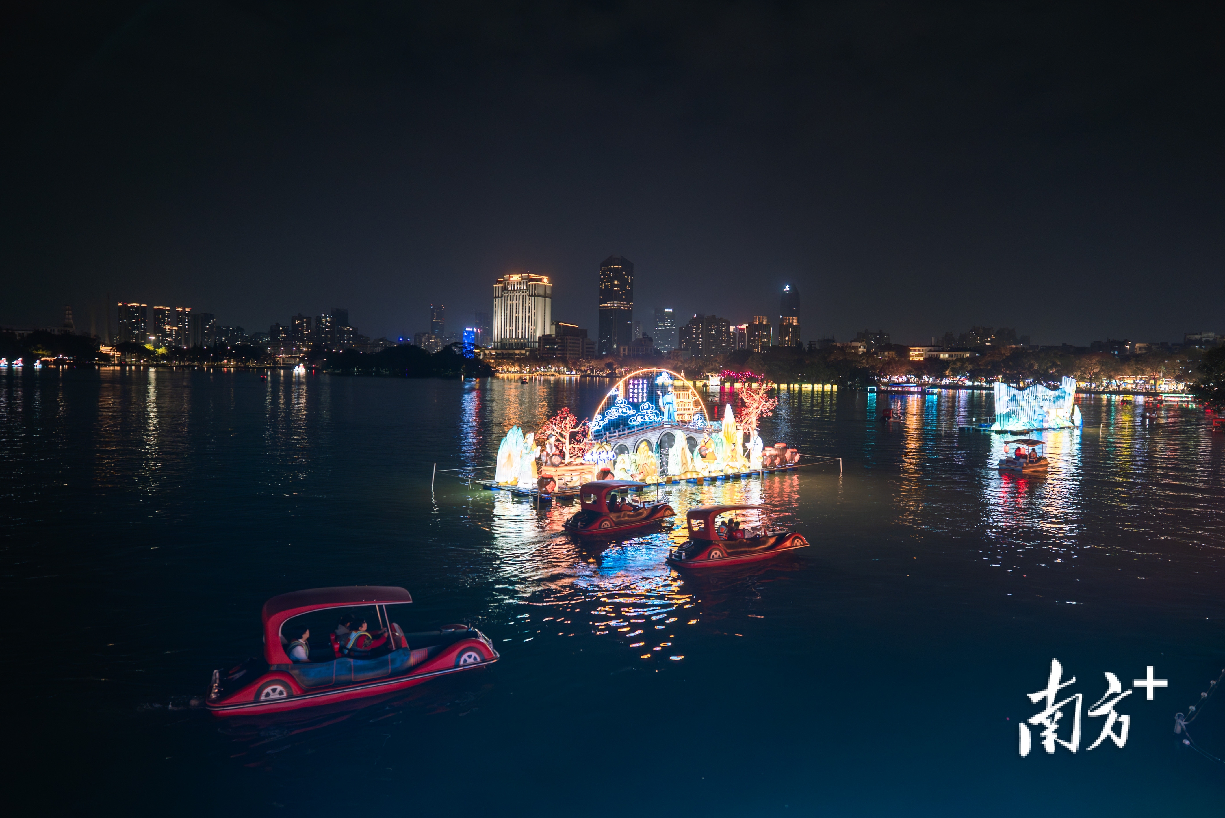 在灯活动现场,西湖景区灯海璀璨。“马到成功”“惠州不在天上,行即到耳”“岭南万户皆春色”“佳人相见一千年”“月亮上写诗”……各色主题花灯瞬间亮起,游船穿行其间,一片美轮美奂。