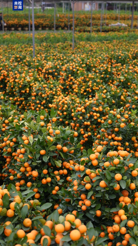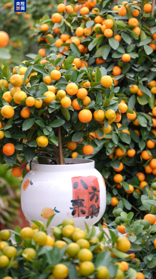 世界上每十盆年桔,就有八盆产自广东顺德陈村。每年农历八月十五前后,年桔开始接受预订,腊月初一到初十是集中出货期,腊月十五起,直接供应各地花市。桔园里,梁钜东正为一盆精品金桔做最后点缀:树顶放上一颗最大的金桔,称作“吉星高照”;周围八颗略小的果实环绕,寓意“八方来财”;下方枝叶间点缀的小果,则象征“遍地黄金”。