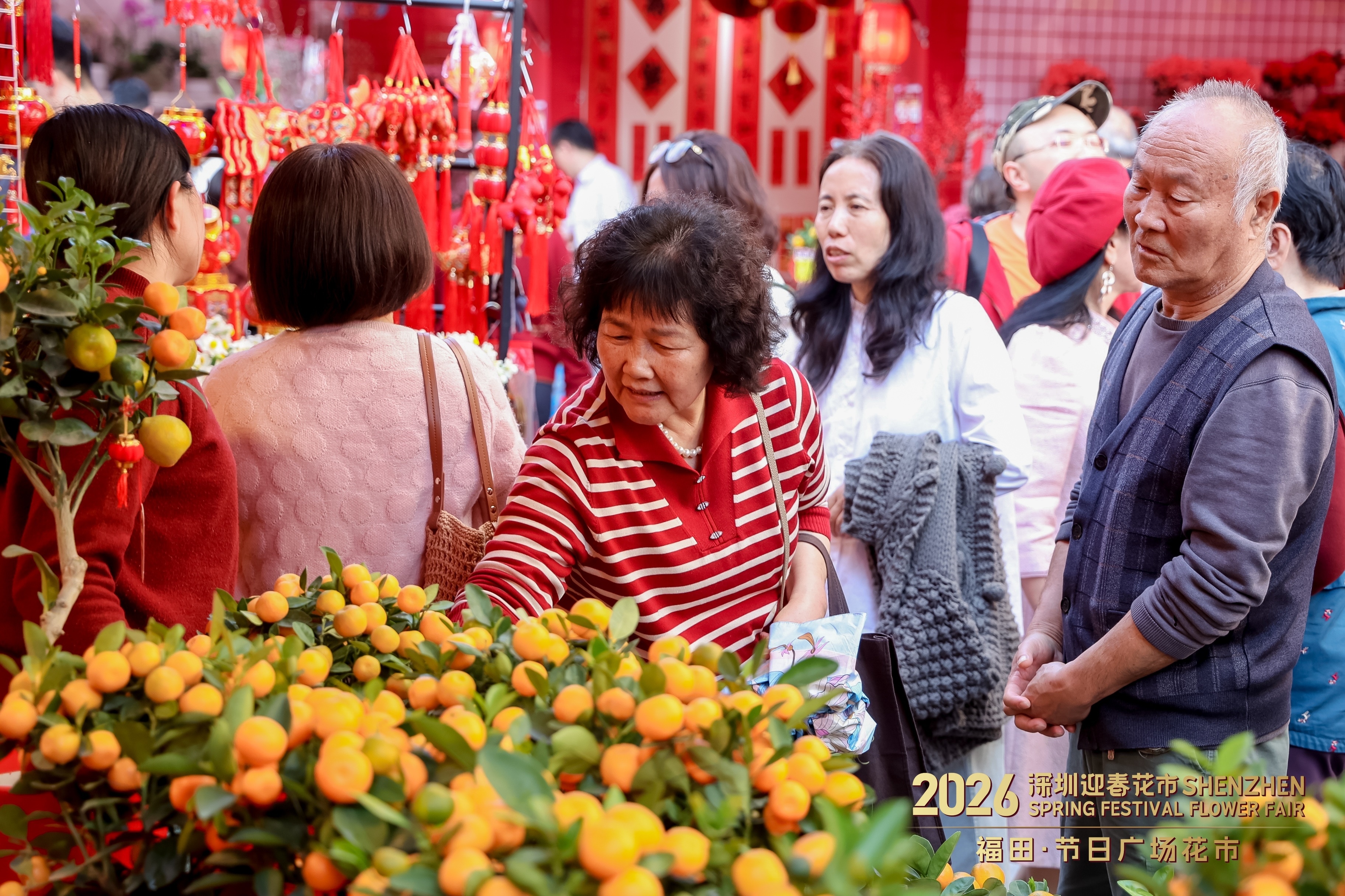 花市现场,喜庆热闹的团圆场景随处可见。来自五湖四海的人们相聚于此,一家人携手行花街、沾喜气、接福运,挑一盆富贵竹、黄金果、发财树,买一副春联、一盏灯笼、一张福字,在挑选心意好物的过程中,将马年“一马当先”“马到成功”“万事顺遂”的美好寓意一并带回家。对于不少选择留深过大年的家庭而言,逛花市不仅是一场休闲之旅,更是一次特别的团圆记忆,让深圳这座移民城市成为大家心安的“团圆家”。