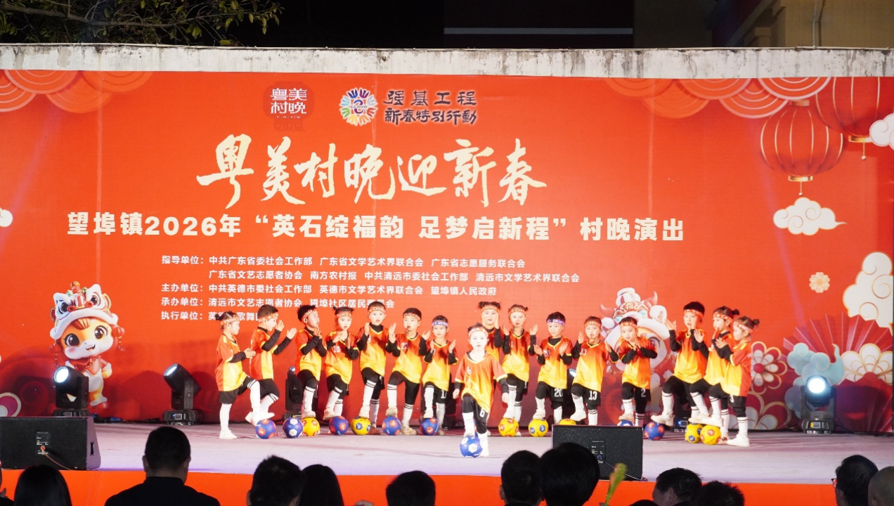 1月29日晚,2026年“粤美村晚迎新春”活动以“英石绽福韵 足梦启新程”为题,吸引了数百名群众共赴这场家门口的文化之约。活动中,由望埠镇中心幼儿园小朋友们表演的《足球小将向前冲》,以活泼可爱的足球操形式,致敬“中国女足摇篮”,展现了望埠人传承拼搏精神、培育体育新苗的生动实践。