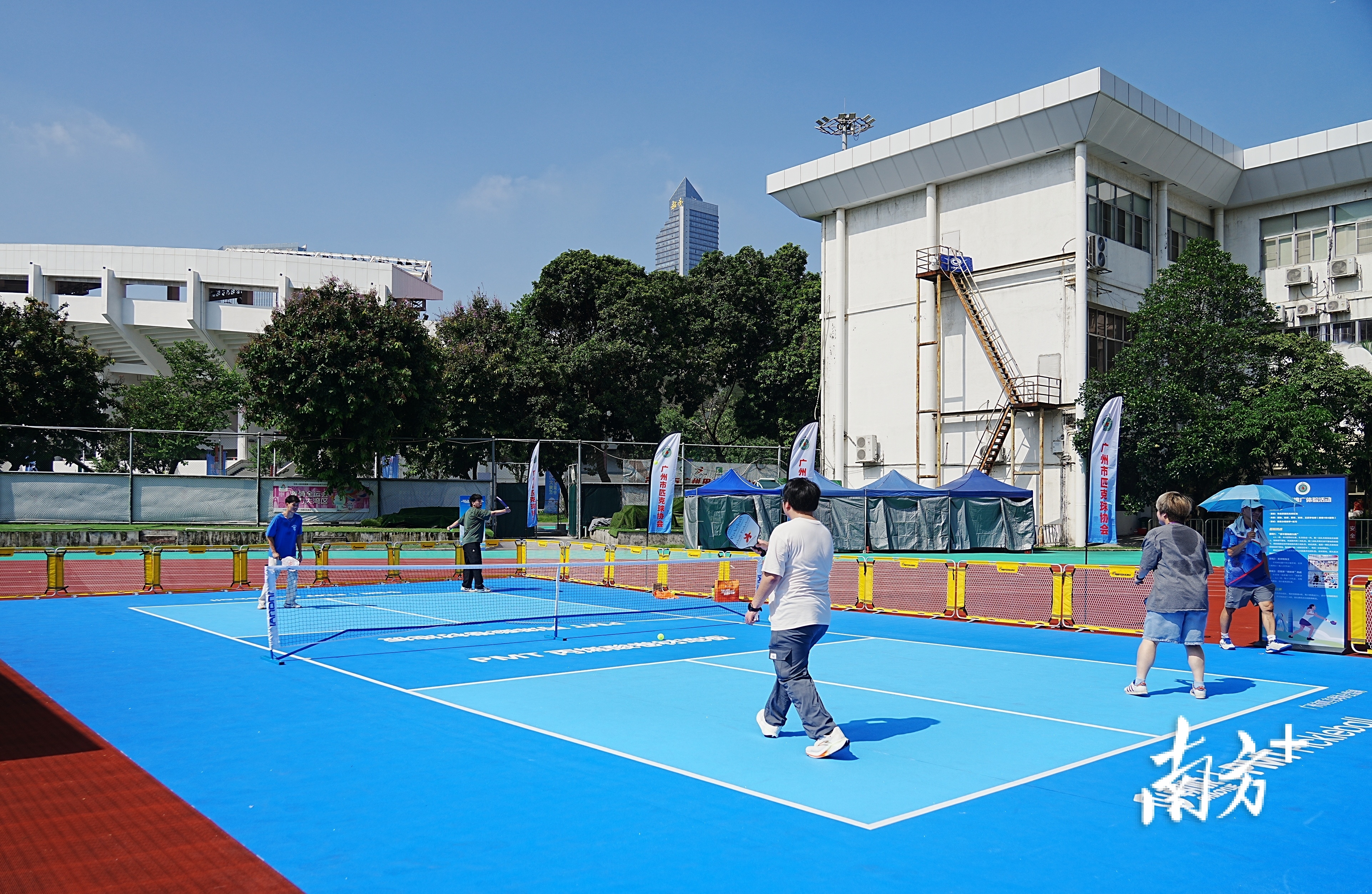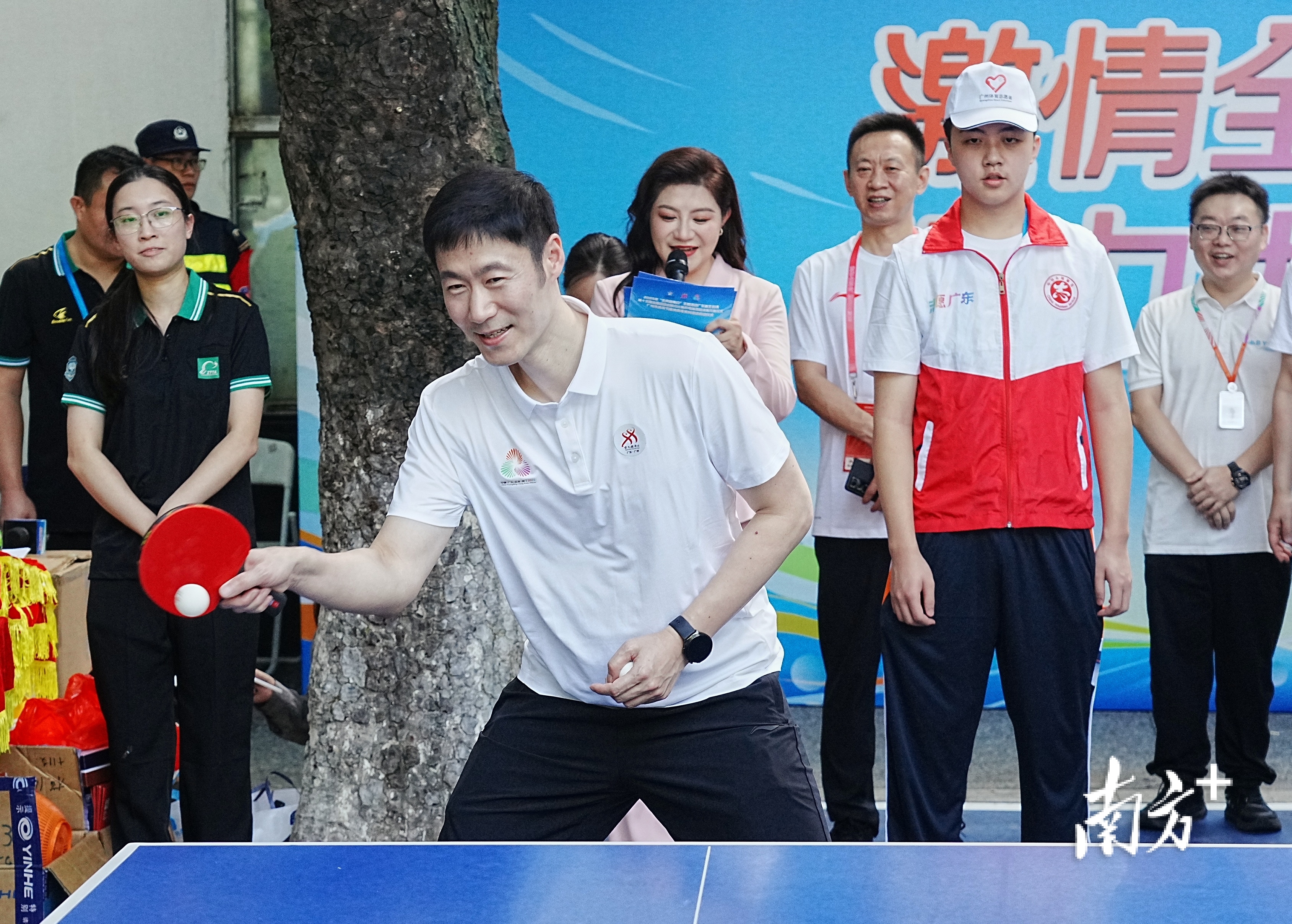 活动当天,恰逢第十五届全国运动会群众比赛乒乓球项目决赛在天河体育中心开打,开球仪式别出心裁地设在天河体育中心百姓乒乓球乐园举行,全国32支参赛队伍代表整装待发,乒乓球奥运冠军乔红、李晓霞、刘诗雯与嘉宾一同挥拍开球,宣布十五运会广州赛区首场群众比赛正式拉开帷幕。