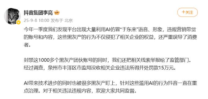 9月8日,@抖音集团李亮 发文:今年一季度我们发现平台出现大量利用AI仿冒“于东来”语音、形象,违规营销带货的账号和内容,这些黑灰产的行为不仅侵犯了相关企业的权益,还严重误导了消费者。封禁这1000多个黑灰产团伙账号的同时,我们还把相关线索举报给了监管部门。经过调查,泉州市丰泽区市监局没收相关企业违法所得并处罚款15万元。详情>>
